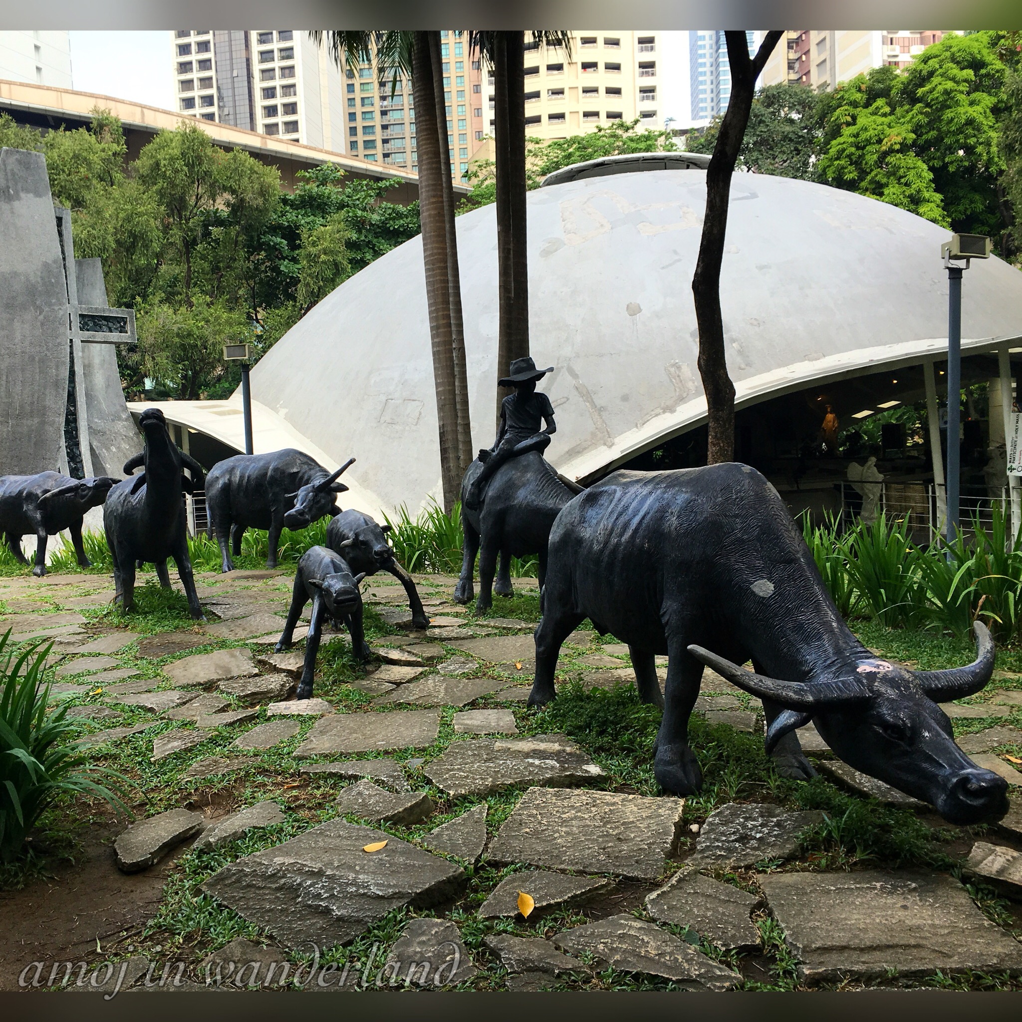 We went first to the Ayala Museum just across the street. However, it was closed on that day, Monday. So we just walked a little until we reached a chapel. I entered just to say a little prayer. Outside the chapel is a lawn with sculptures of water buffaloes.