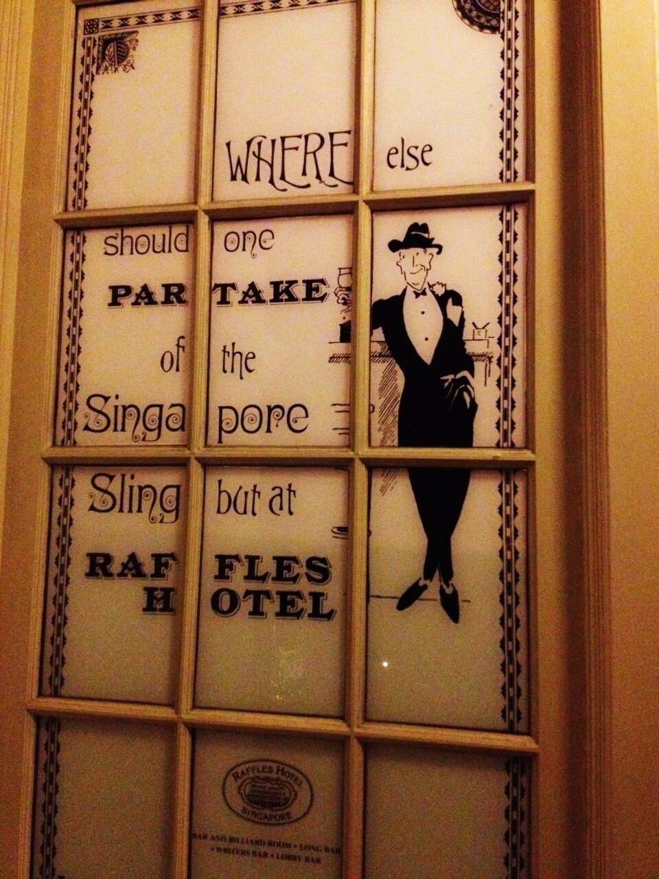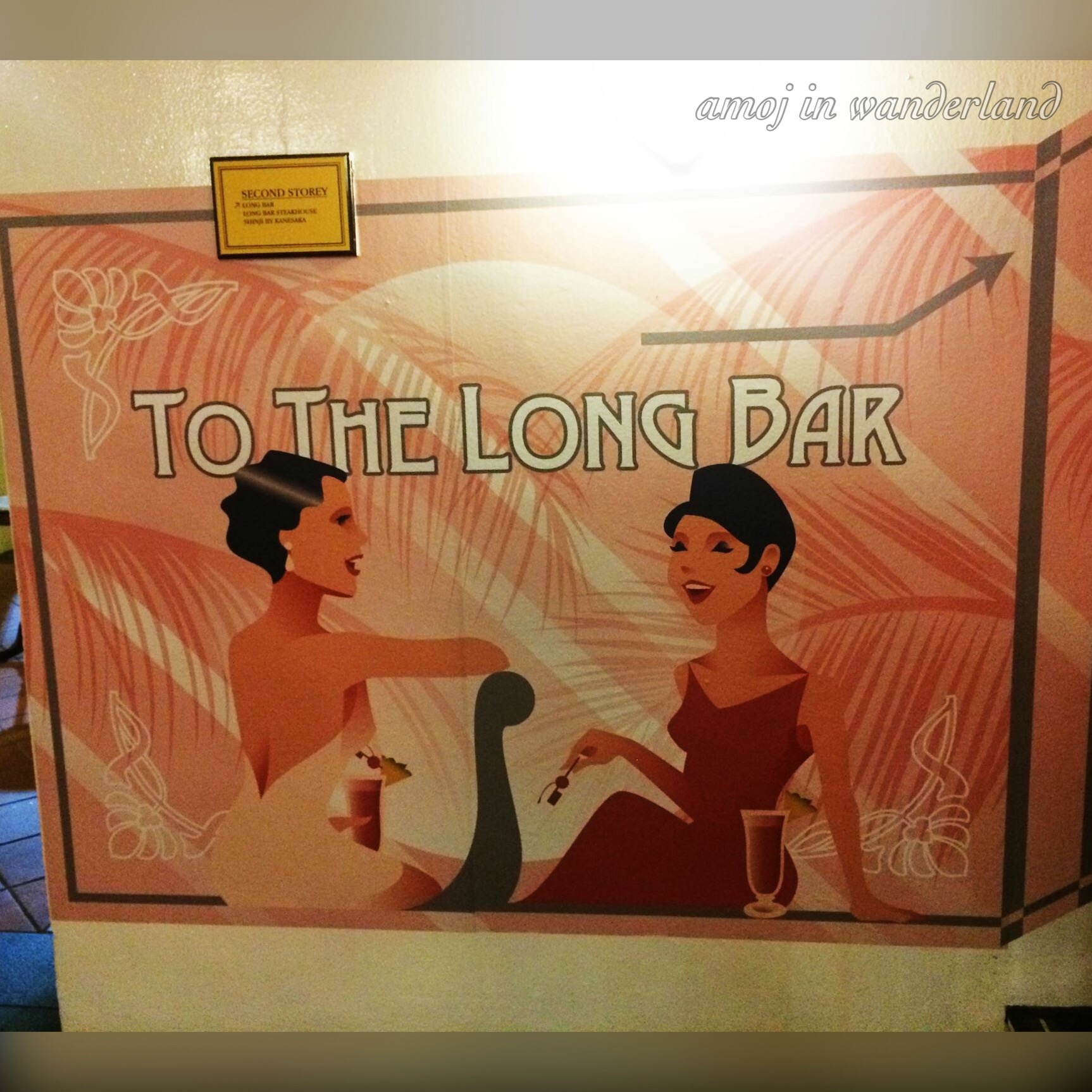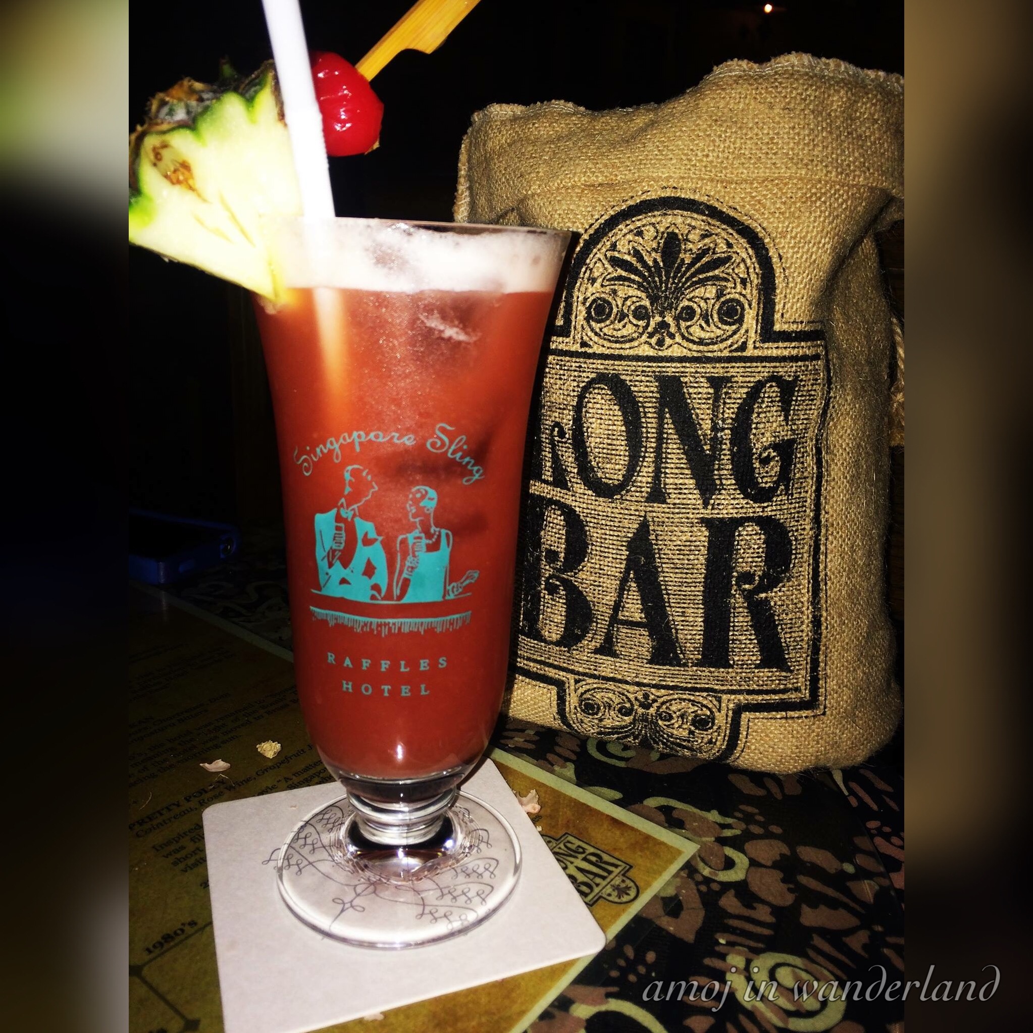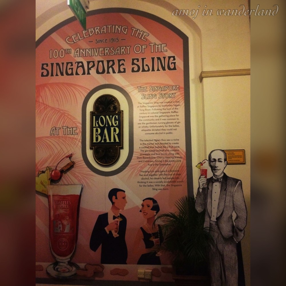 Singapore Sling was originally created in the Long Bar.This way to Long Bar.The Long Bar is a two-storey bar located at the second floor of the hotel. The interiors are inspired by the 1920’s Malayan plantation life. In contrast to strict rules of Singapore, littering is encouraged inside the bar as proven by the peanut shells scattered on the floor.