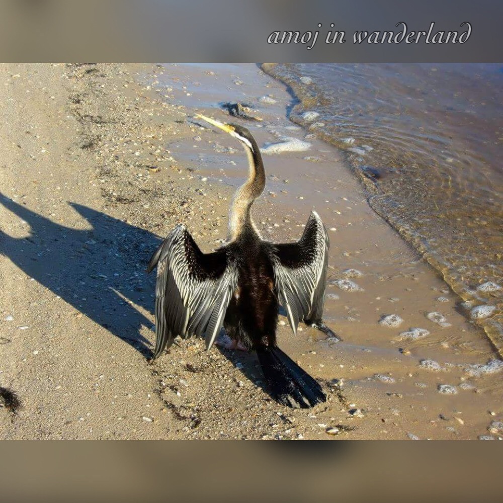 Male australasian darter drying its wings.The Australasian darter or Australian darter (Anhinga novaehollandiae) is found in Australia, Indonesia, New Zealand, and Papua New Guinea. Darters are water birds whose feathers are not waterproof. So they are usually seen spreading their wings to dry themselves (as I saw one doing this). They were also called snake-birds as they resembled snakes when they go hunting for their prey, with their bodies submerged and only their necks and heads above the surface of water. Their very long and sharp beaks are very useful in catching their prey.