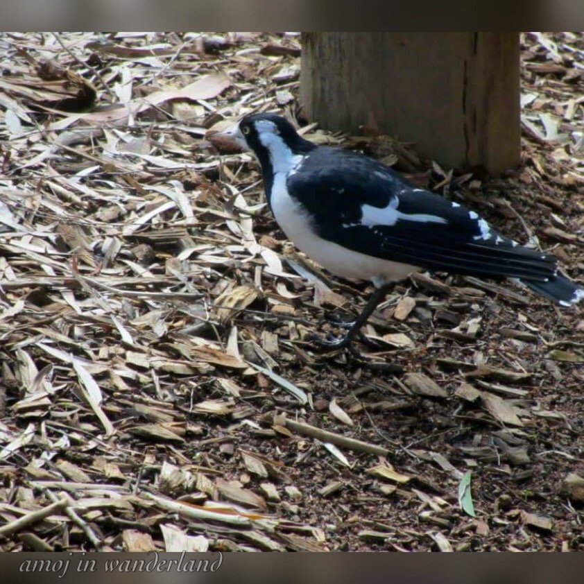 A female magpie-larkAt first, I thought it was a pied crow or the Australian magpie. But my friend bird expert told me it was a magpie-lark. The magpie-lark (Grallina cyanoleuca) is a common and very widespread bird occupying almost all parts of Australia. My friend also told me that what I saw is a female as it has a white throat. The male magpie-lark, in contrast, has a black throat and a white eyebrow.