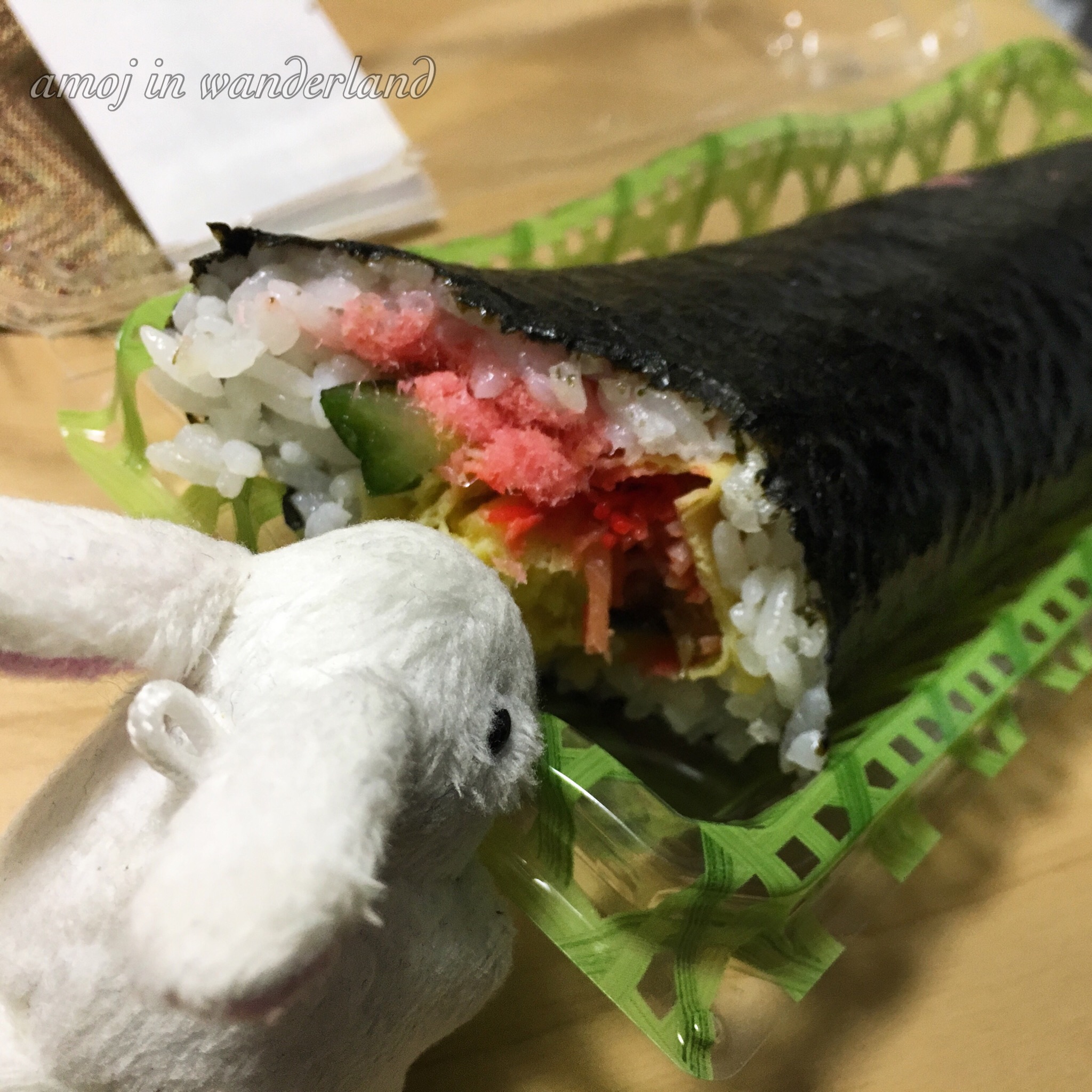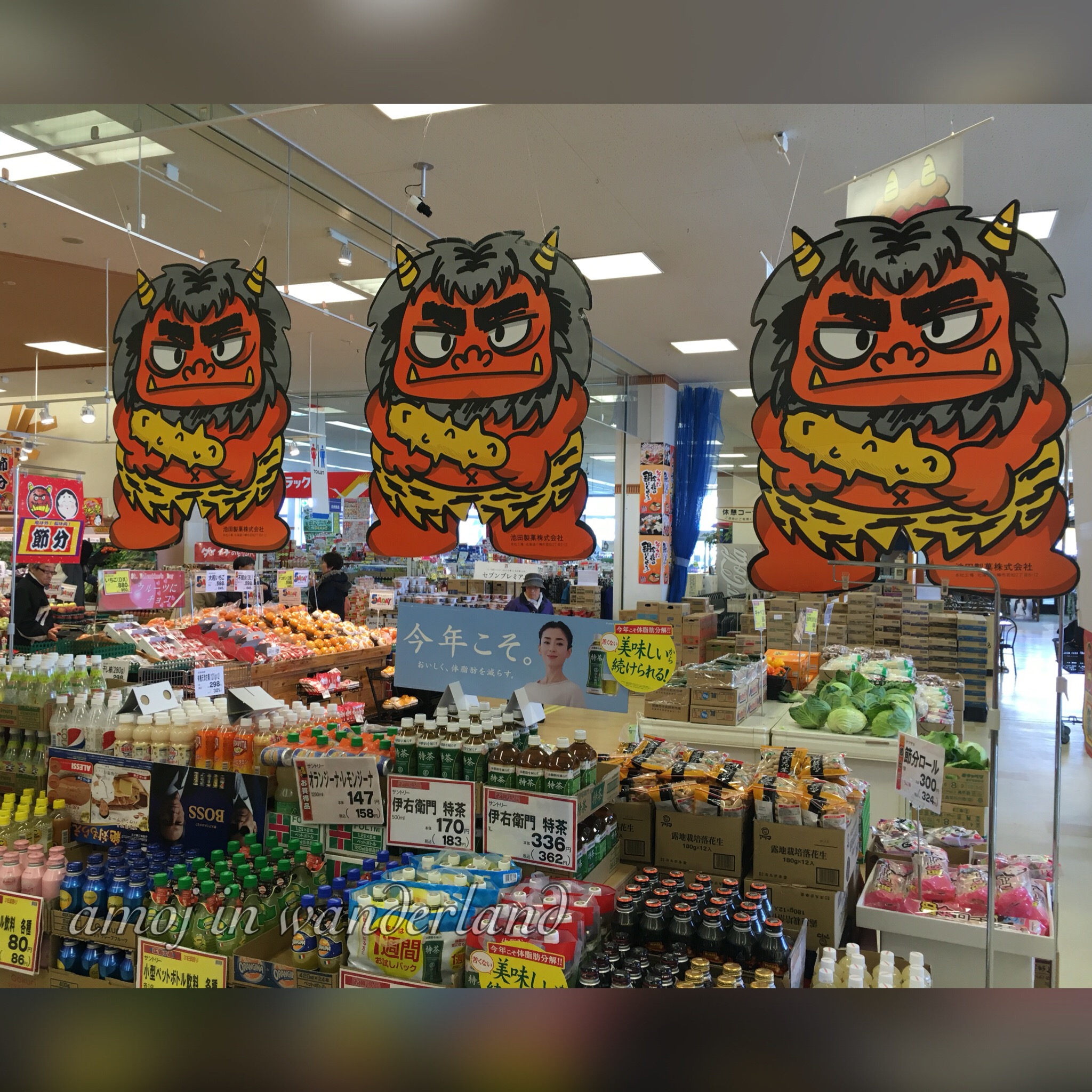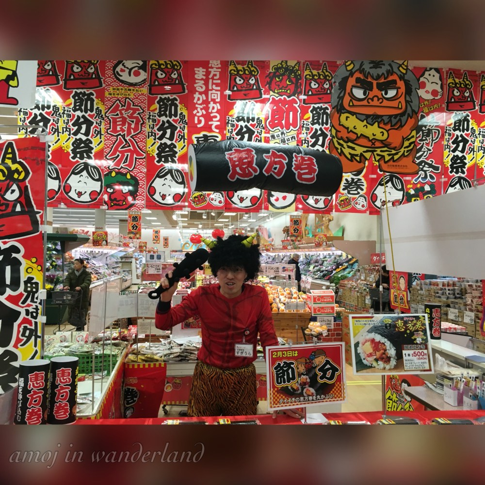Setsubun ogres at the grocery.In the Kansai area of Japan, there is another tradition of eating uncut makizushi called ehō-maki. The grocery nearby was selling this stuff, so I bought it for my dinner. And by the way, the vendor was wearing the ogre costume.