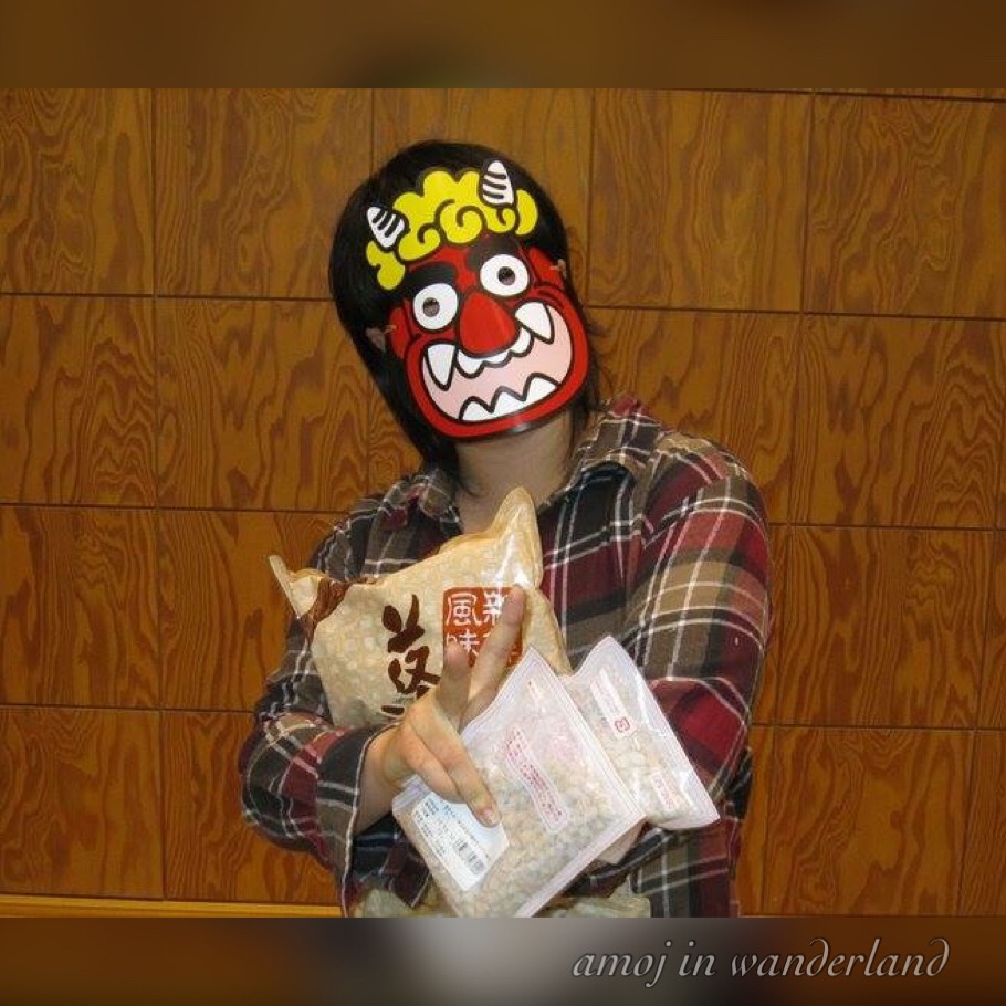 My labmate wearing a Setsubun Oni mask in 2011.Japanese celebrate Setsubun by throwing soybeans either out the door or at a person wearing an Oni (demon or ogre) mask. This is done to ward off evil spirits that bring misfortune and bad health. This custom known as mamemaki was originally introduced by the Chinese during the 8th century.
