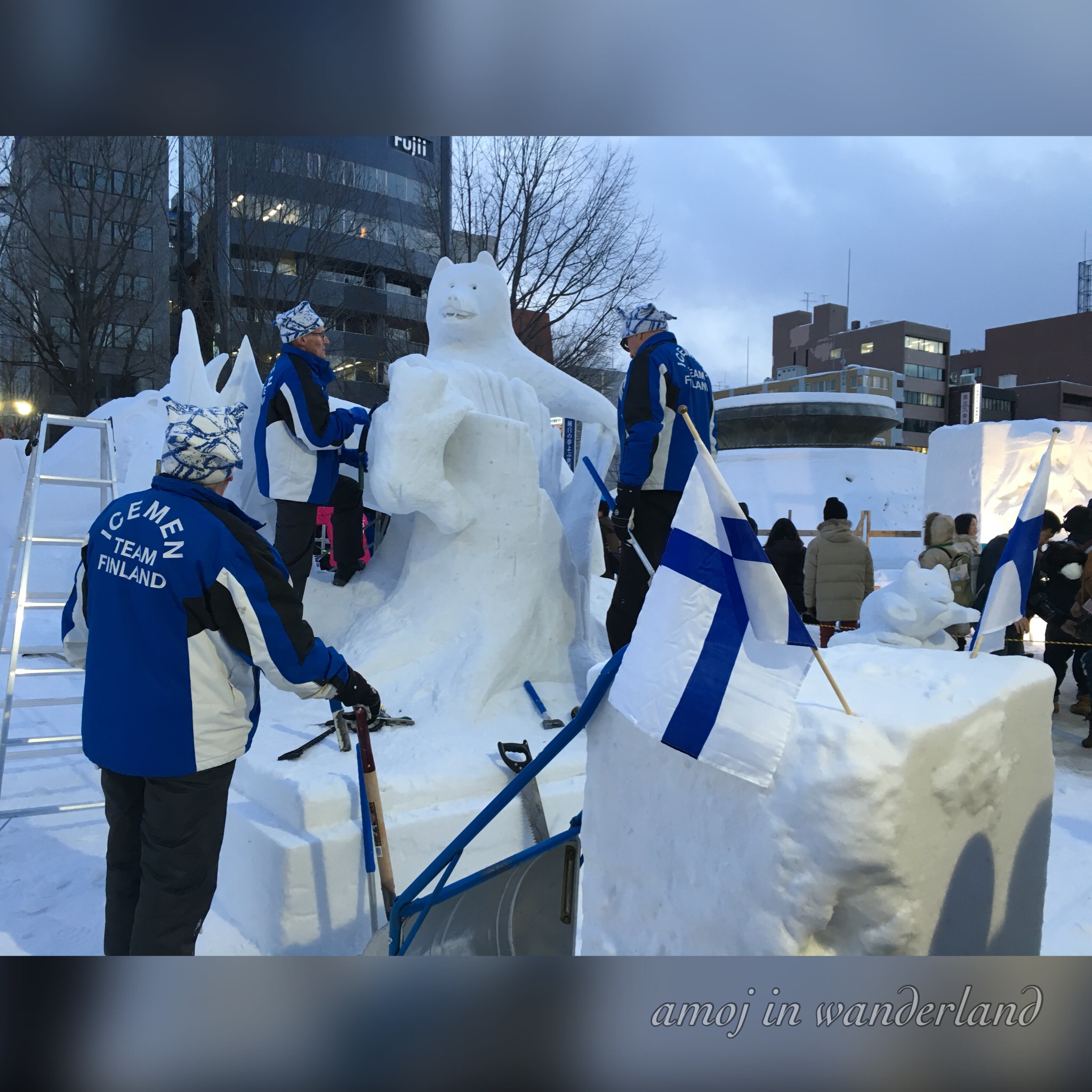 Team Finland doing their snow sculpture for the international contest.We also went to the second venue of the festival, the Susukino Ice World with several ice sculptures.