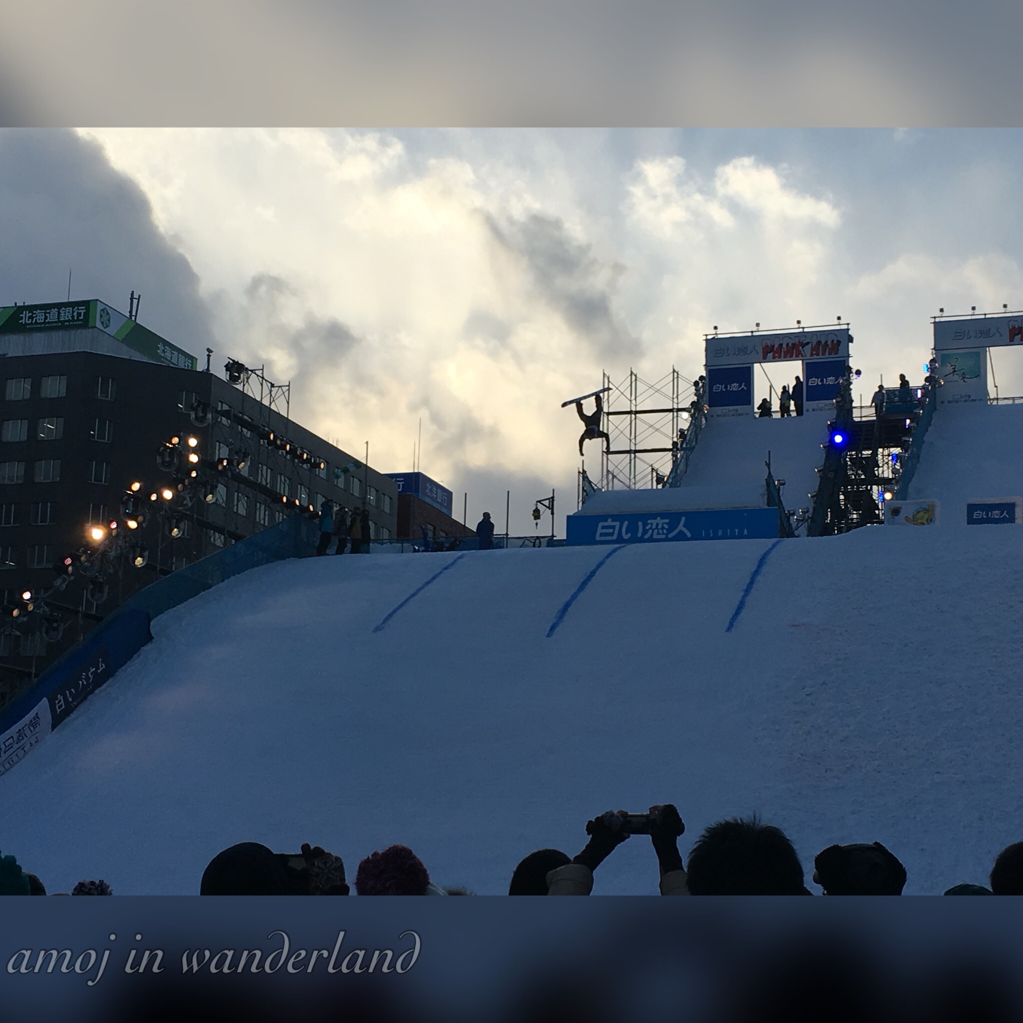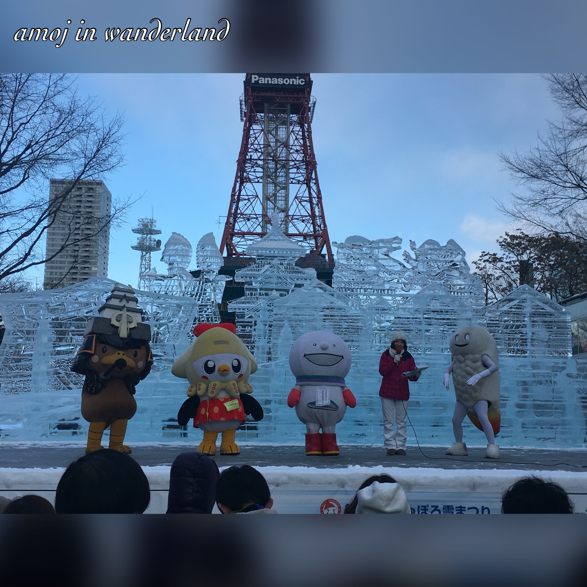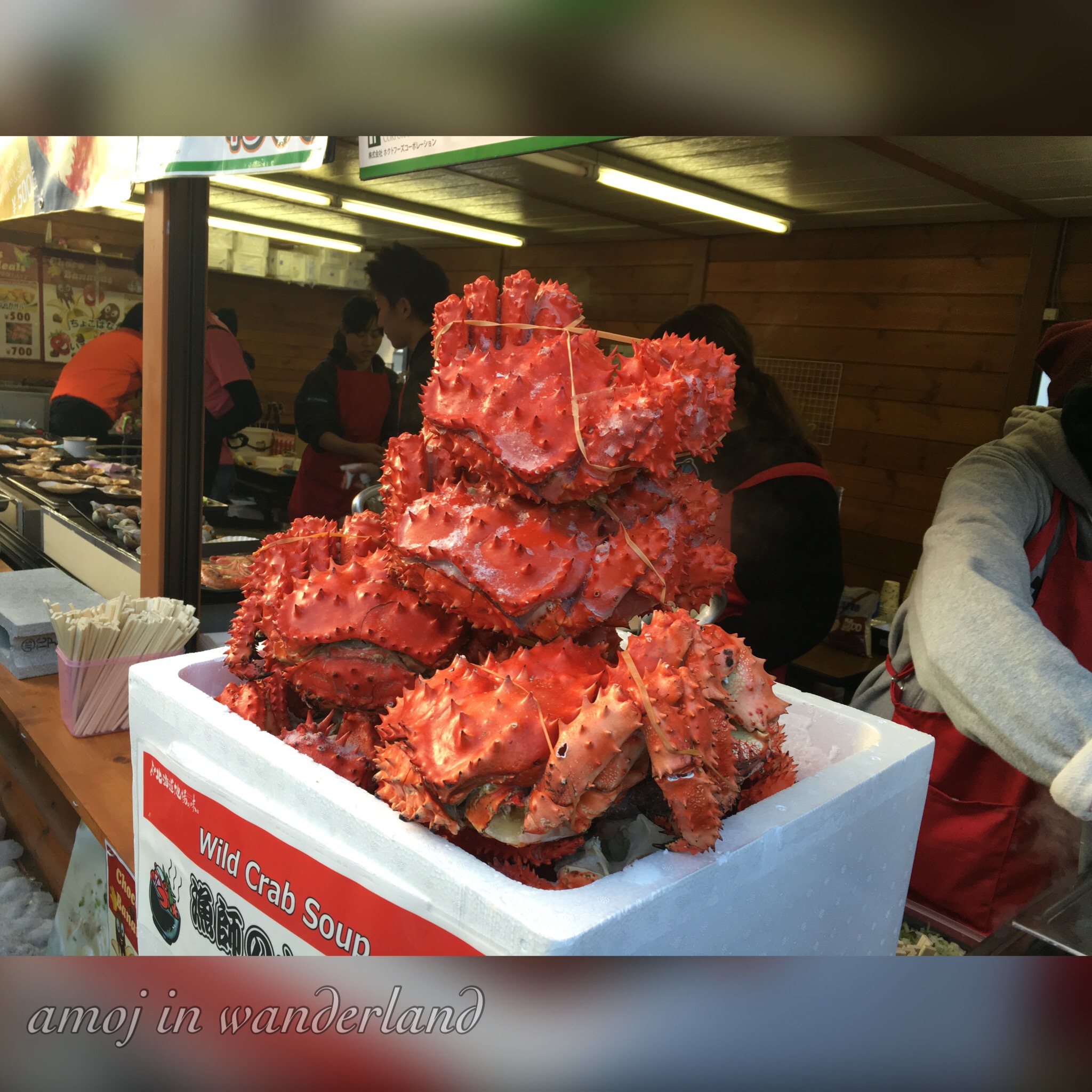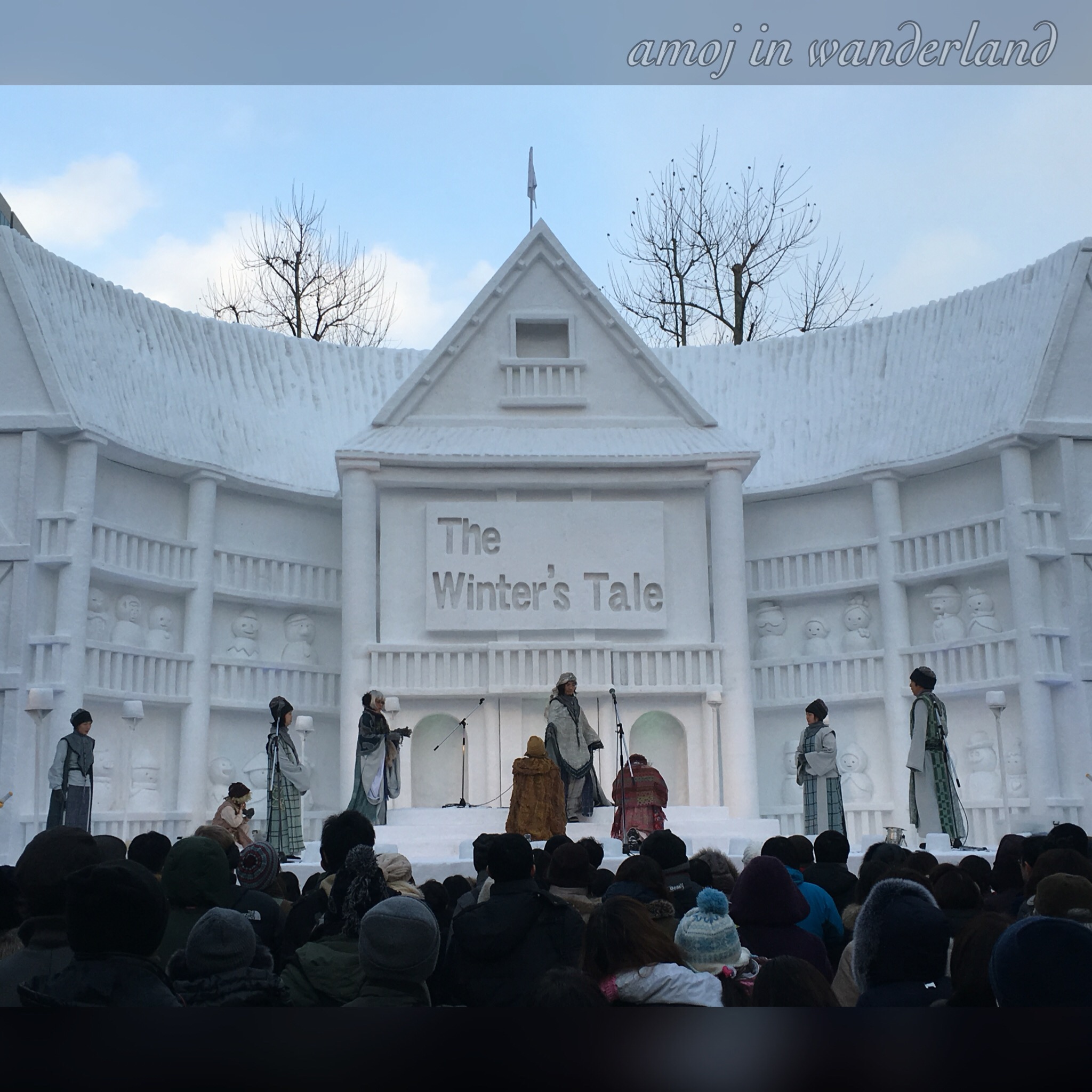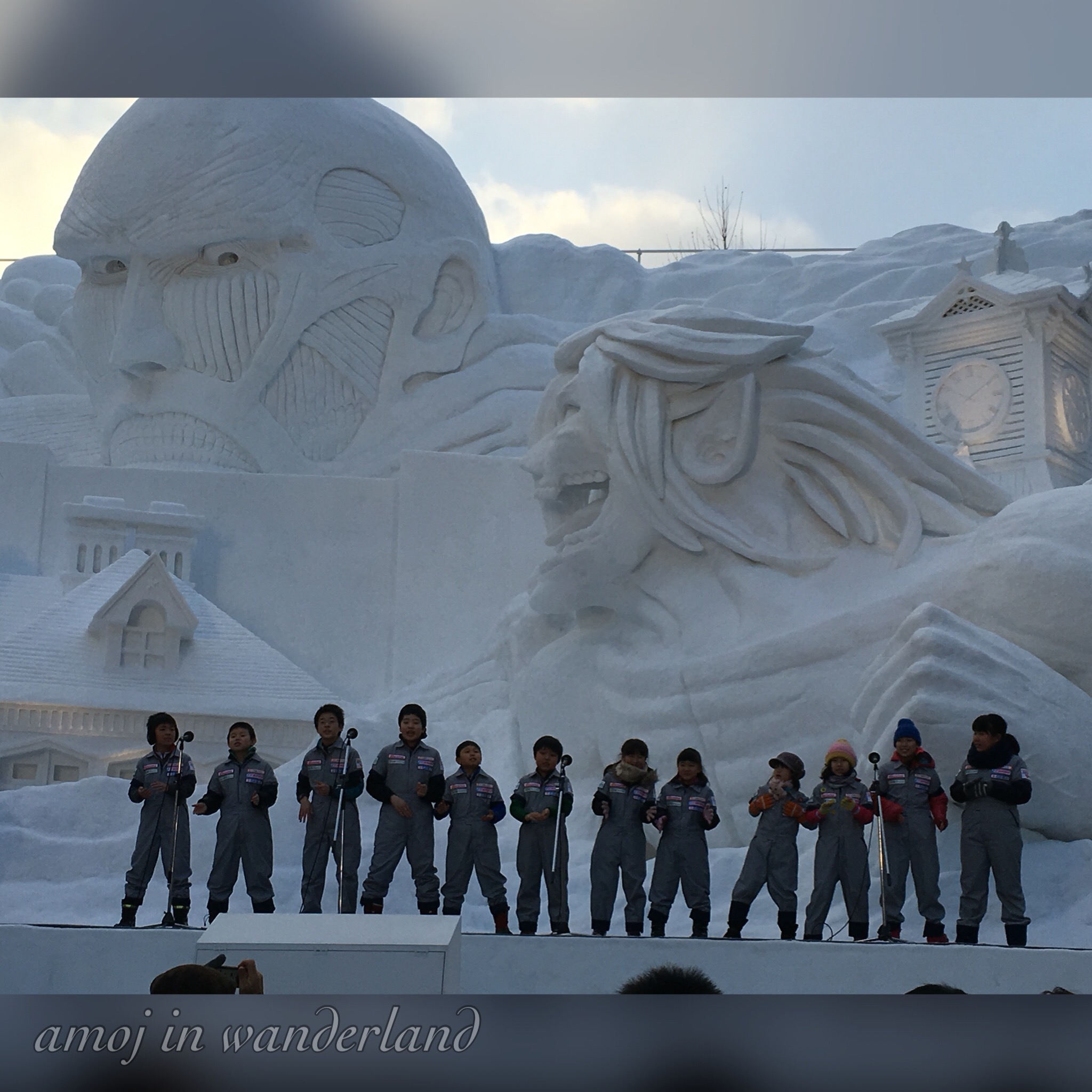 A stage drama performance at The Winter’s Tale snow stage. Kids singing at the Shingeki no Kyojin stage Mascots at the snow stage. Snowboarding exhibition Large crabs at a food stall selling crab soup.Aside from the snow sculptures, there are the usual food stalls, performances, the snowboarding exhibitions and the 43rd international snow sculpture contest. This year, 12 teams are competing which includes Australia, Daejeon Metropolitan City (Korea), Finland, Hawaii, Indonesia, Latvia, Macao, Malaysia, Poland, Portland(United States), Singapore and Thailand. The winner will be announced on Tuesday.