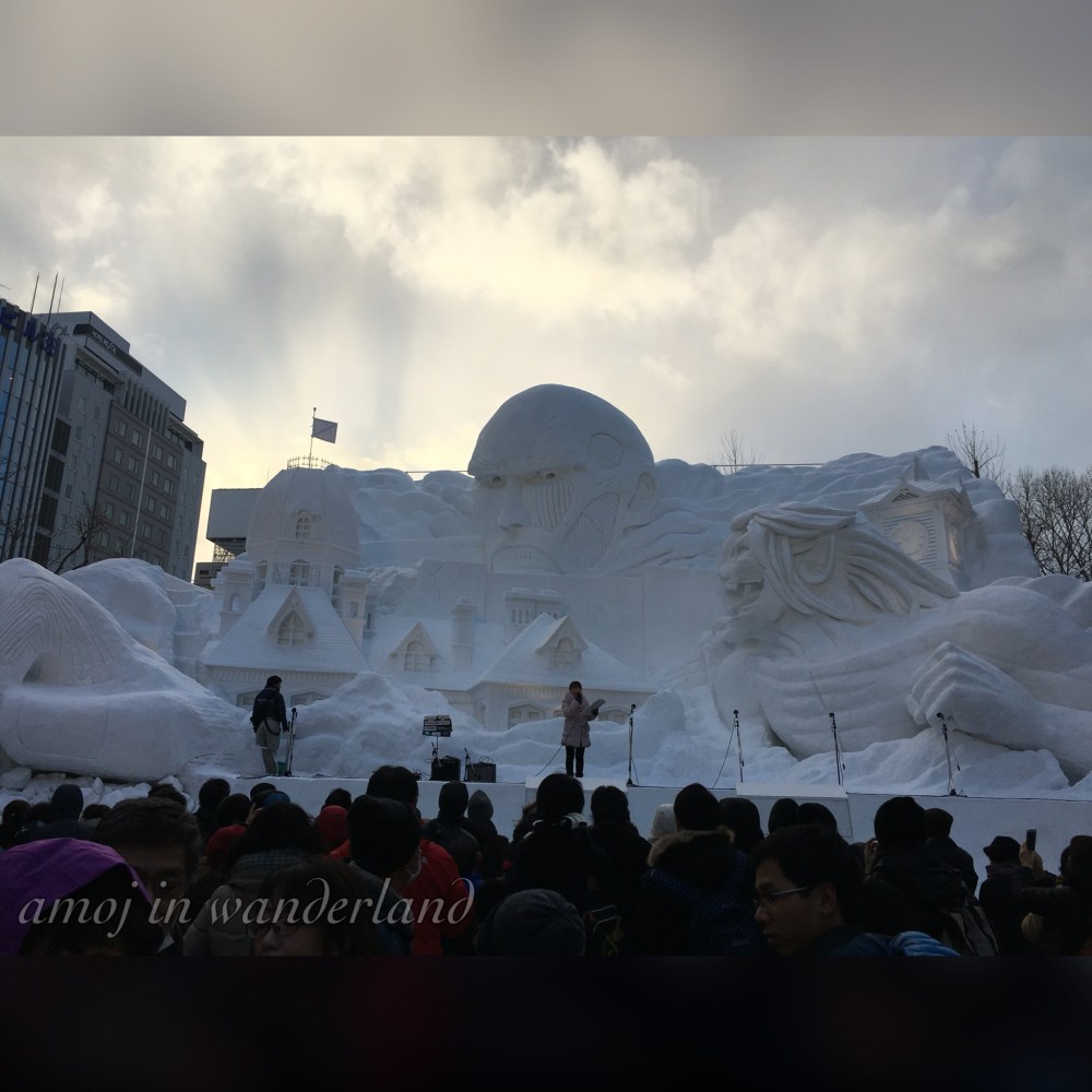 The colossal Shingeki No Kyojin snow sculpture.For the 5th time, I am here in Sapporo to see the Snow Festival. Last year’s Star Wars snow sculpture was awesome but this year’s Shingeki No Kyojin is also cool. The sculpture featured the gigantic man-eating humanoid together with Sapporo’s very own Akarenga (Former Hokkaido government building) and Sapporo Clock Tower.