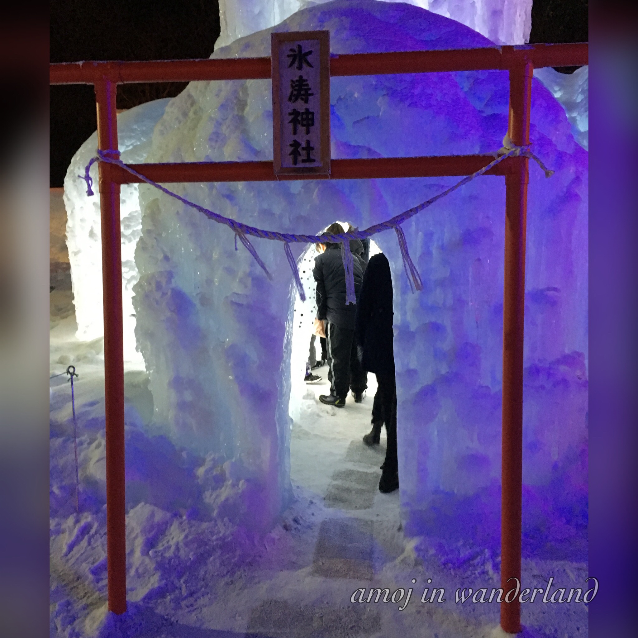 The sculptures were lighted in different colors.The festival place is located near the Yamasen iron bridge. There’s an entrance fee-donation of 300 yen to enter the festival. The ice sculptures were made from the water of the Lake Shikotsu which is famous for being one of the clearest water in Japan.