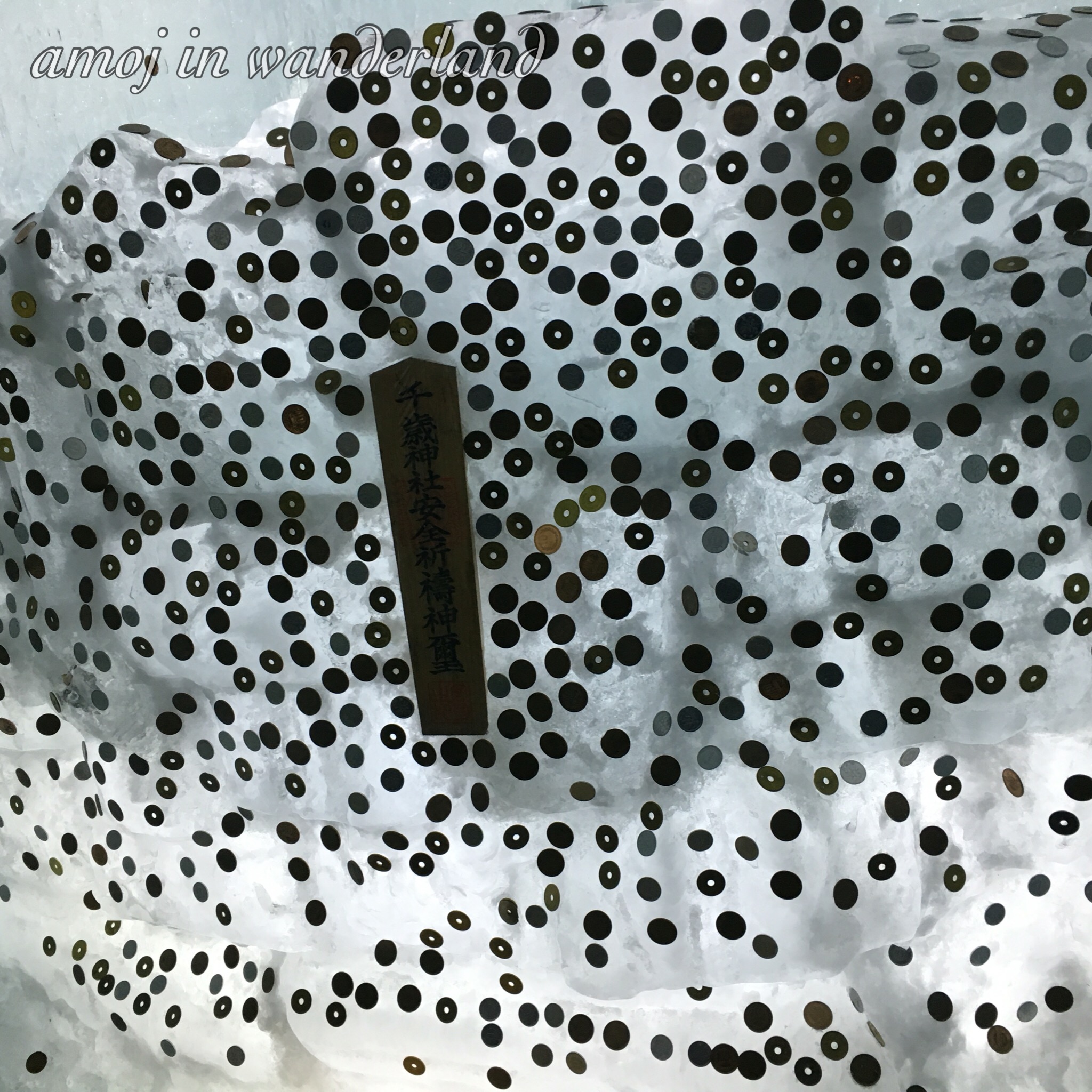 A shrine at the Lake Shikotsu Ice Festival The coins on the ice wall of the shrine. A snow igloo A church-like structure with a bell inside.Among the sculptures are the igloos with colored lights inside, the church-like structure where you can ring a bell inside and the shrine decorated with many coins on its ice wall. There is also an ice slide with many children playing on it.
