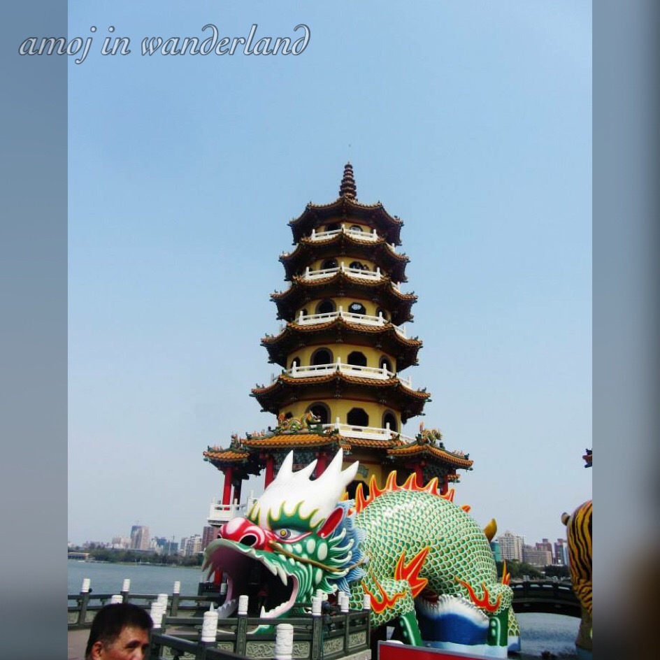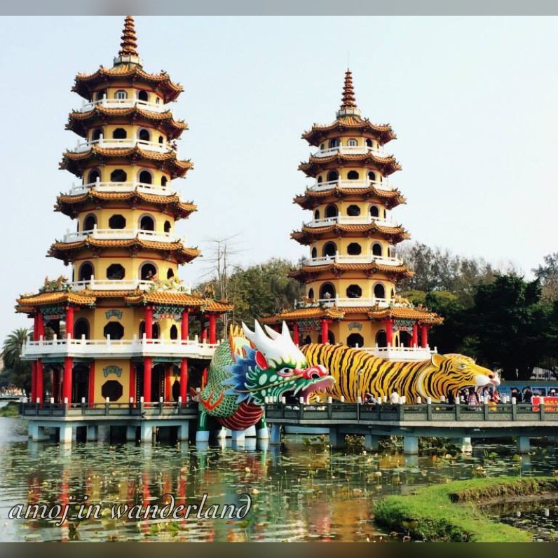 Exit the tiger.The Dragon and Tiger Pagodas is a temple located at the Lotus Lake in Zuoying District of Kaohsiung City, Taiwan. Consists of two 6-storey towers, one with a dragon entrance and the other with a tiger, it was said that it will bring good luck to visitors if they enter through the dragon’s mouth and exit out of the tiger’s mouth.