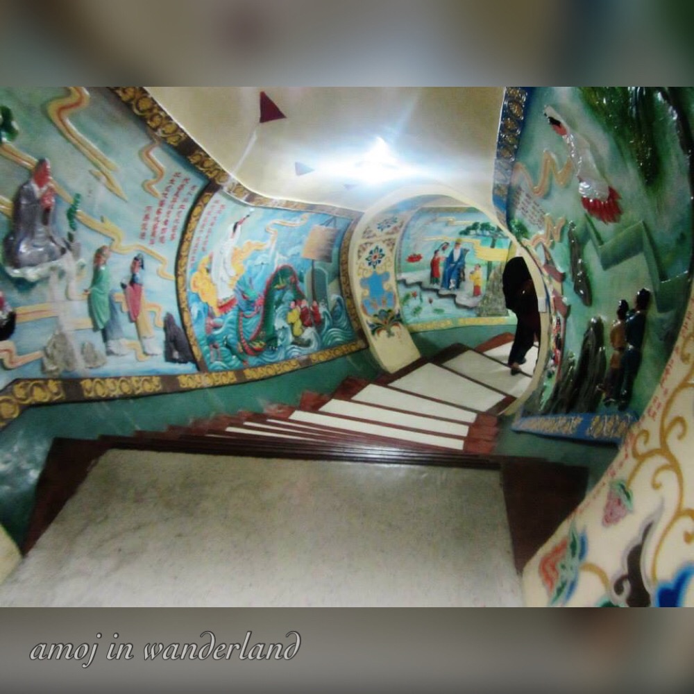 Finches rest at the roof edges of the pagoda.The towers contain paintings depicting Ksitigarbha, the bodhisattva of hell-beings, as well as paintings of Confucius and the Jade Emperor’s palaces. The towers have a double spiral staircase separately used for ascending and descending of the visitors.