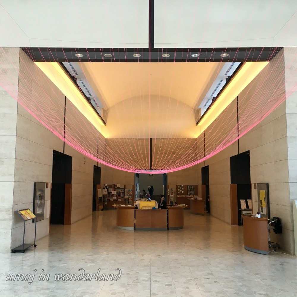 The web of pink strings made by Seiji Yamagishi.Obviously, the exhibit showed contemporary art made by Japanese artists. When we entered the museum, we were welcome by a web of pink strings made by Seiji Yamagishi. Then, we paid the entrance fee of 620 yen, with 100 yen discount from the coupon that I got.