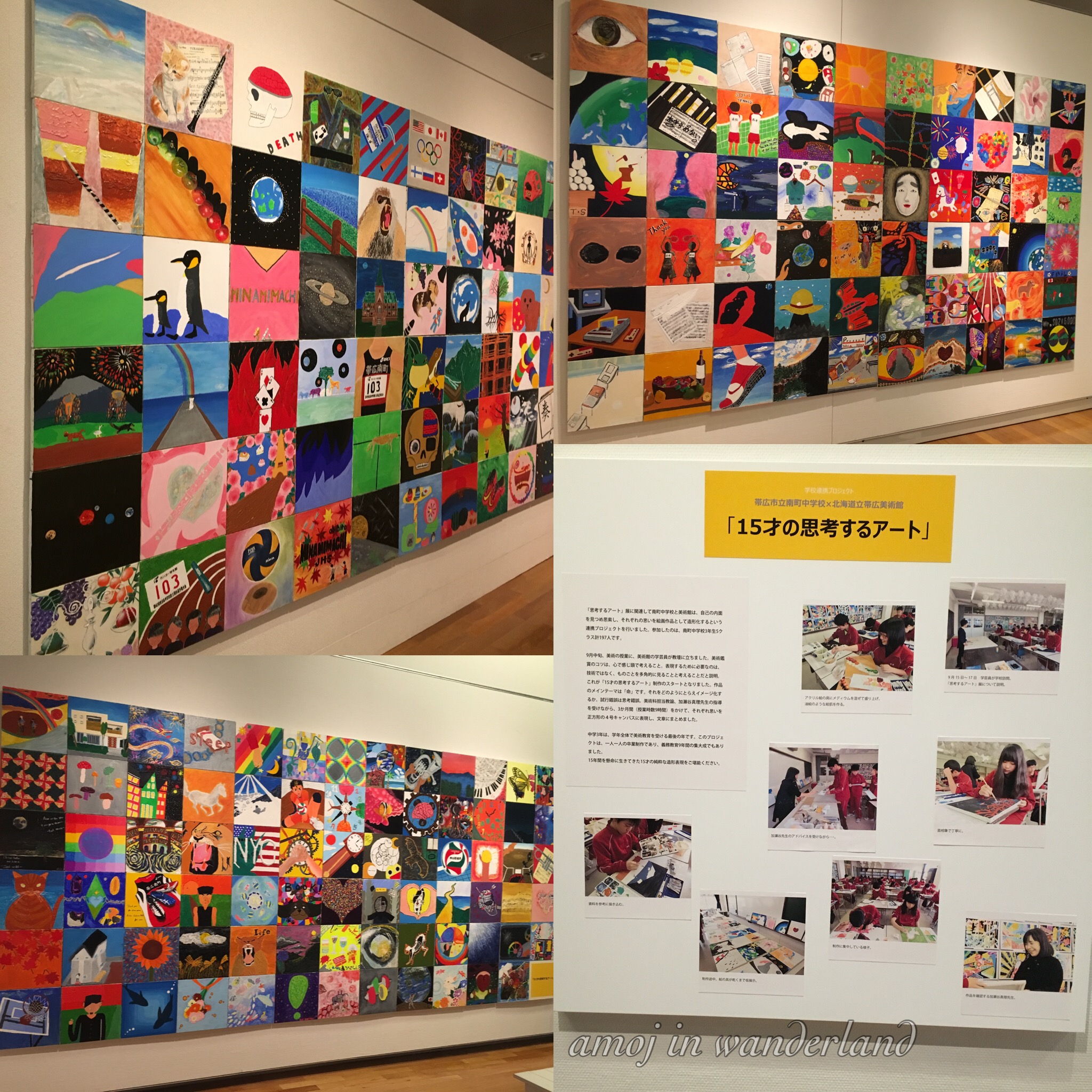 Collective artwork done by Junior High School students.The interesting parts of the exhibit are the “Four Word Stories” and the collective artwork done by Junior high school students. The “Four Word Stories” is a collection of four words from about 200 people that will best express their thoughts or ideas. These are collected by the contemporary artist Midori Ikeda and placed it in plastic tape to create a one-page story about each participants.