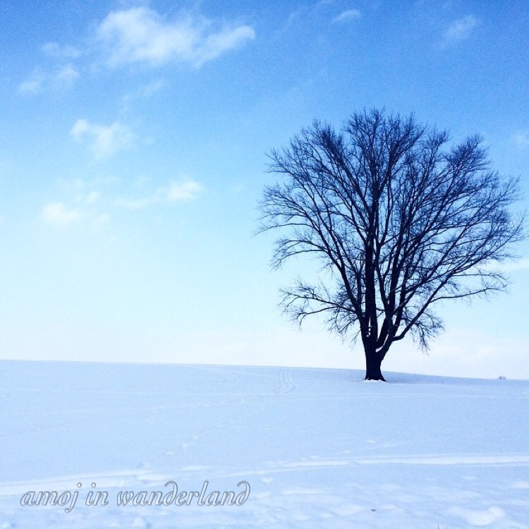 I visited the so-called “Philosophy” tree in Hokkaido twice, in summer and in winter. Although it is covered with lush green foliage in the summertime, I like it more in winter. Standing alone in the white-linen hills, the tree, looking like it was lost in thoughts, has made the place interesting at the time when almost everything was on hibernation.