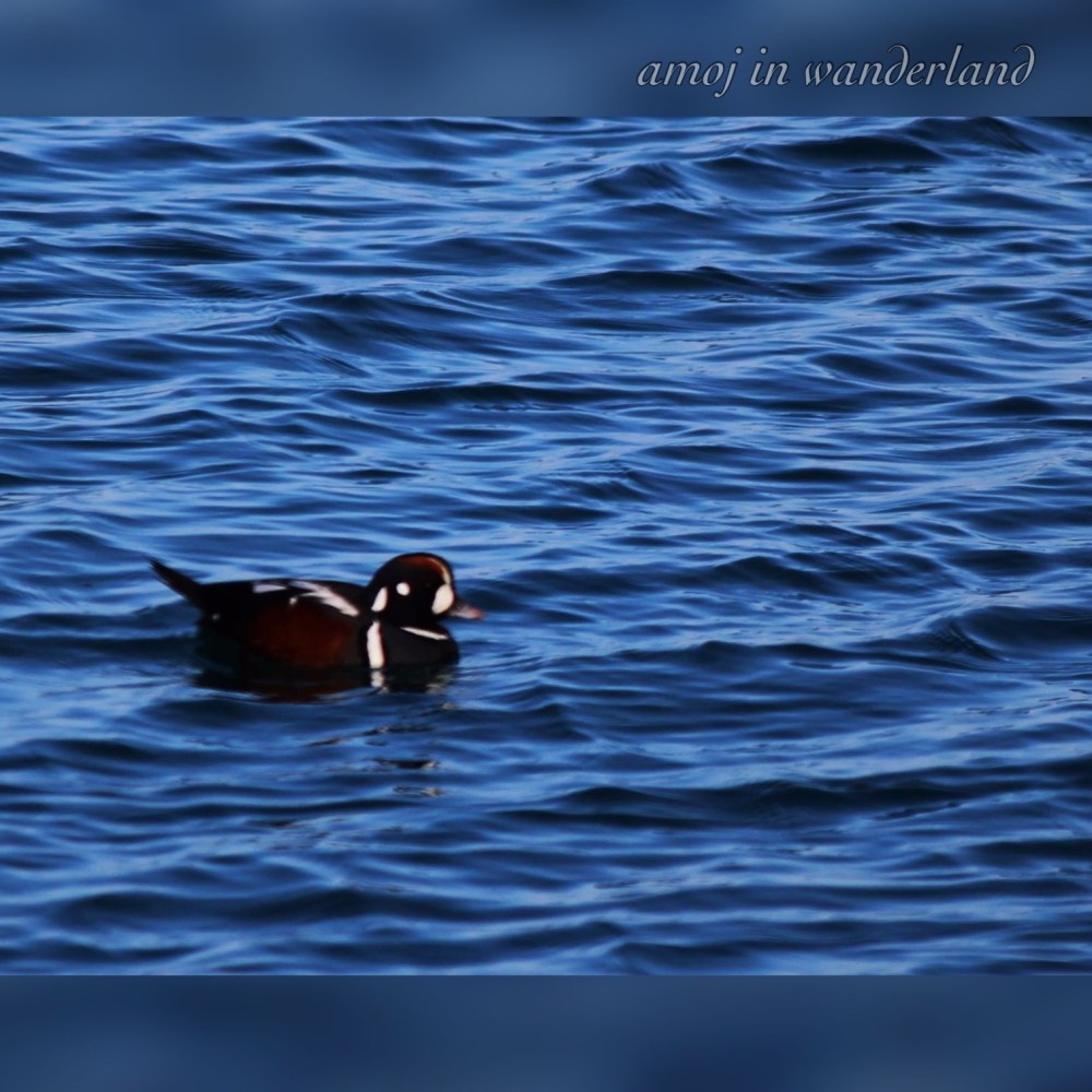 A Harlequin duck.One of the most interesting birds we saw was the harlequin duck (Histrionicus histrionicus). Taking its name from the colorfully dressed character in the theatrical show known as Commedia dell’arte, the adult breeding males have a colorful and complex plumage pattern. It was so artistically beautiful that you cannot missed it in a crowd of many ducks.