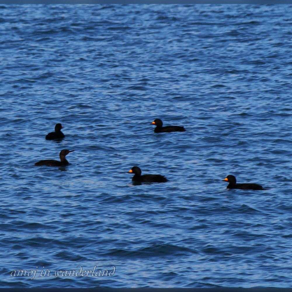 Four black scoters and a pelagic cormorant.We went to the fishing port in Hiroo where we found many species of fish-hunting birds. We saw the black scoters (Melanitta americana) characterized by their yellow bulbous bill; the pelagic cormorant (Phalacricirax pelagicus) who have relatively short wings to provide economical underwater movement;