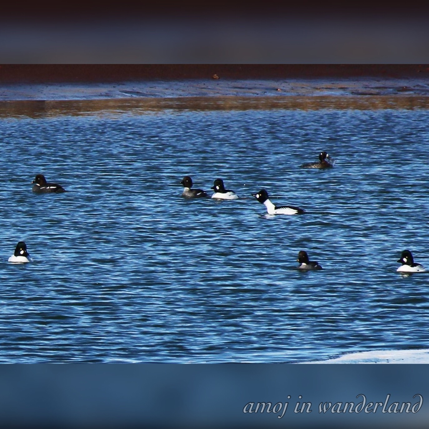 Eurasian wigeons.While looking for the sea eagle, we saw different birds instead.At the seaside where we thought we can find the sea eagles were the Eurasian wigeons (Anas penelope). We went to Toyokoro port where we spotted a raft of common goldeneyes (Bucephala clangula). This duck was named for its golden-yellow eye and characterized by the male having a circular white patch below the eye in its dark head.