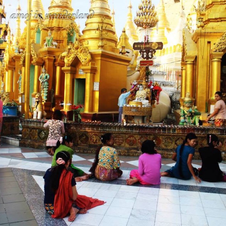 Myanmar devotees in Shwedagon.During our tour around the pagoda, there were a lot of devotees and monks doing some religious rites like washing the statues, offering flowers, worshipping and meditating. I also saw a group of caucasian tourists filming a documentary about the place.