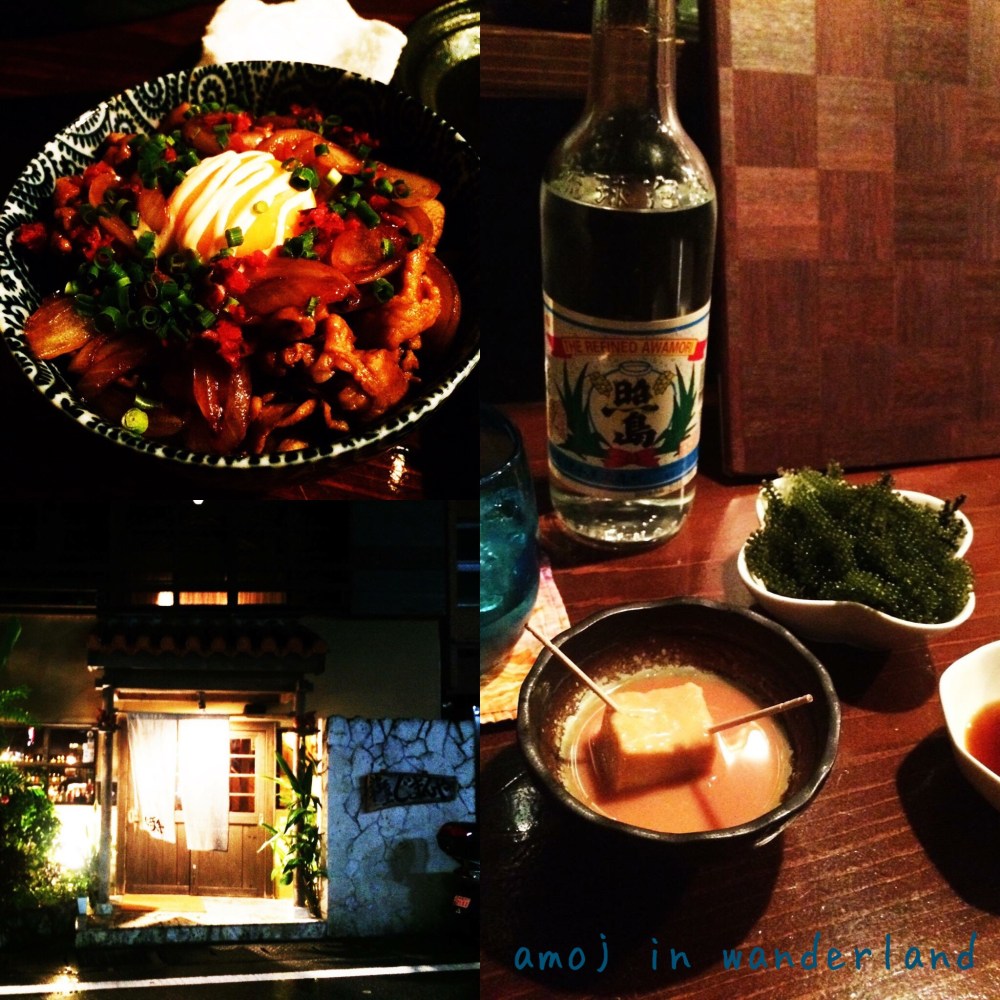 Together with awamori, I had umibudo and tofuyo. Umibudo or sea grapes are delicate sea weed clusters that pop like bubbles in the mouth. Tofuyo is a pungent fermented tofu served in a tiny, two-centimeter cube. As it was my first time to eat a stinky tofu, I didn’t like it. I also ordered a bowl of butadon.