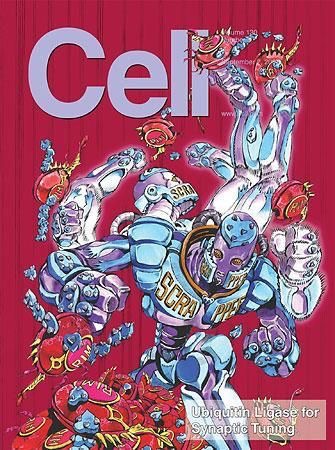 Posters of Araki’s works.One interesting work by Araki is with the cover for the September 2007 issue of the scientific journal Cell where upon the request of the two Japanese researchers Dr. Mitsutoshi Setou and Dr. Hiroshi Ageta asked him to draw their identified protein “Scrapper” as a manga character. This protein helps in regulating the synaptic activity in the nervous system. This is a very good way of infusing popular culture in scientific breakthroughs.