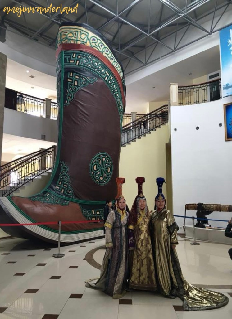 Stepping into the visitor center offered refuge from the winter cold, along with a vivid walk through the Mongol Empire’s legacy. The museum displays Hunnu artifacts, items from the height of Mongol expansion, ornate weaponry, and cultural relics that narrate an empire’s rise. One of the most unforgettable sights is the enormous traditional Mongolian leather boot, standing nine meters tall, an unexpected yet playful reminder of the scale and creativity of this complex. Visitors can also try on royal costumes for photographs, immersing themselves briefly in the regal world of khans and queens.