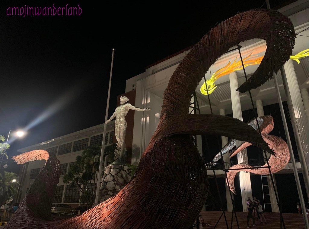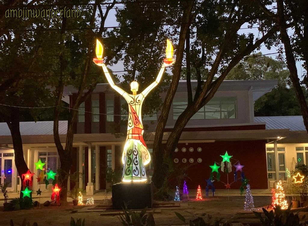 Babaylan figures in various stages of the “pagdidiwata” ritual dance, practiced by the Palawanon or Tagbanua people in seeking the assistance of spirits during moments of crisis, are positioned on streetlamp posts along University Avenue. These figures are interspersed with lanterns that represent the essence of life and the astral soul. Moreover, above the Oblation, there is a lantern resembling a shooting star known as a “heavenly gift,” symbolizing the link between the earthly realm and the heavens.