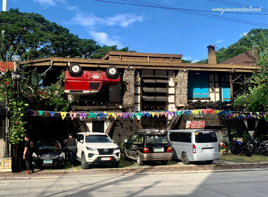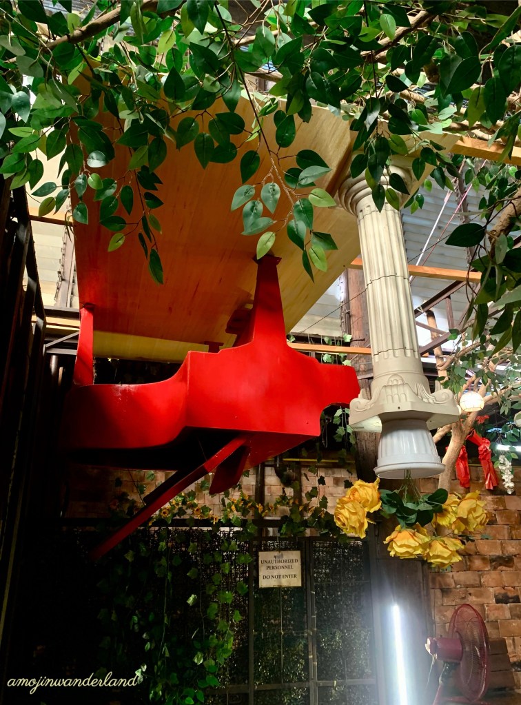 At the facade of the restaurant, there used to be a car and a bicycle hanging upside down, with tables, chairs, and a black piano affixed to the ceiling inside. However, not all of these elements have been maintained in the current appearance of the shop. When I revisited the restaurant after 11 years, I was disappointed to find that only the car outside and a repainted red piano were left hanging upside down. This change could be attributed to the effects of the prolonged lockdown due to the pandemic.