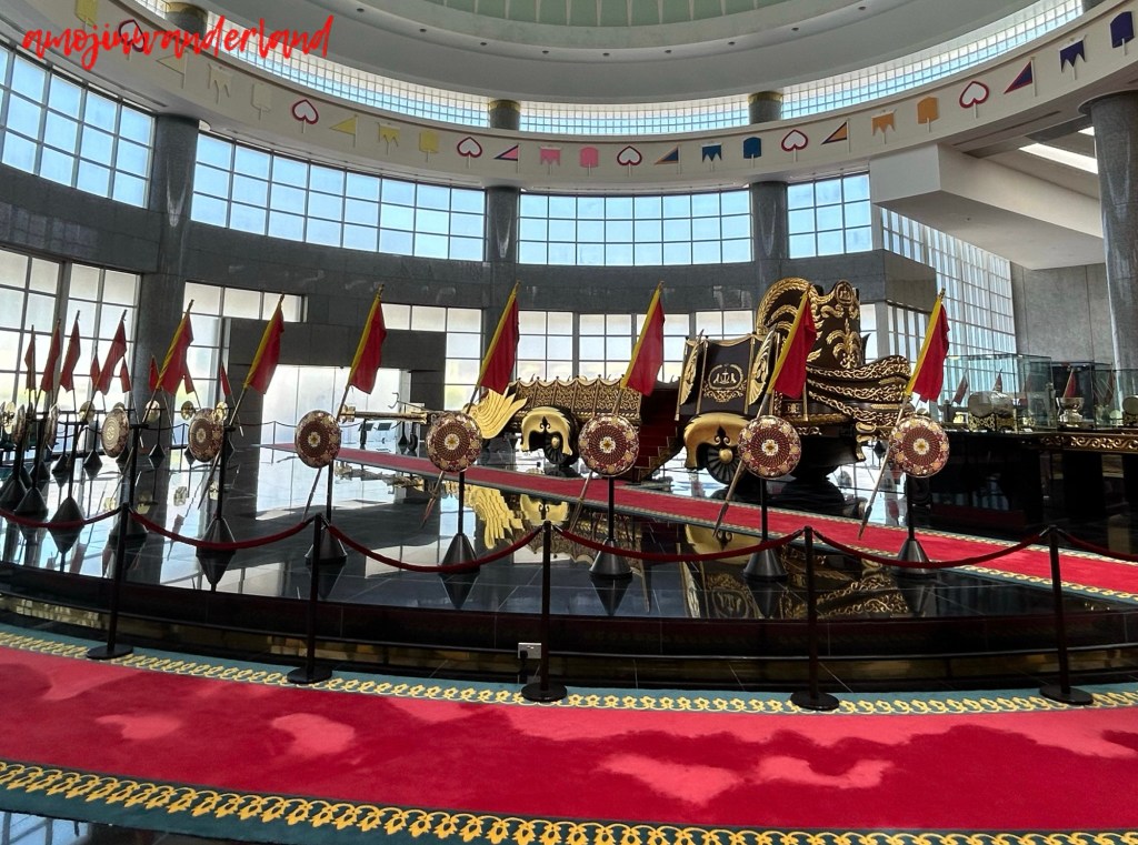 During our tour of Brunei, we visited the Royal Regalia Museum, conveniently located in the city center and easily recognizable by its prominent white and silver dome. Similar to Brunei’s grand national mosques, the museum’s interior boasts imported marble. Originally constructed by Sultan Saifuddien, the building was initially named the “Churchill Memorial Building” after the former UK Prime Minister, Sir Winston Churchill.
