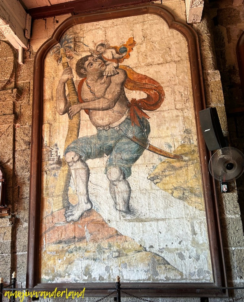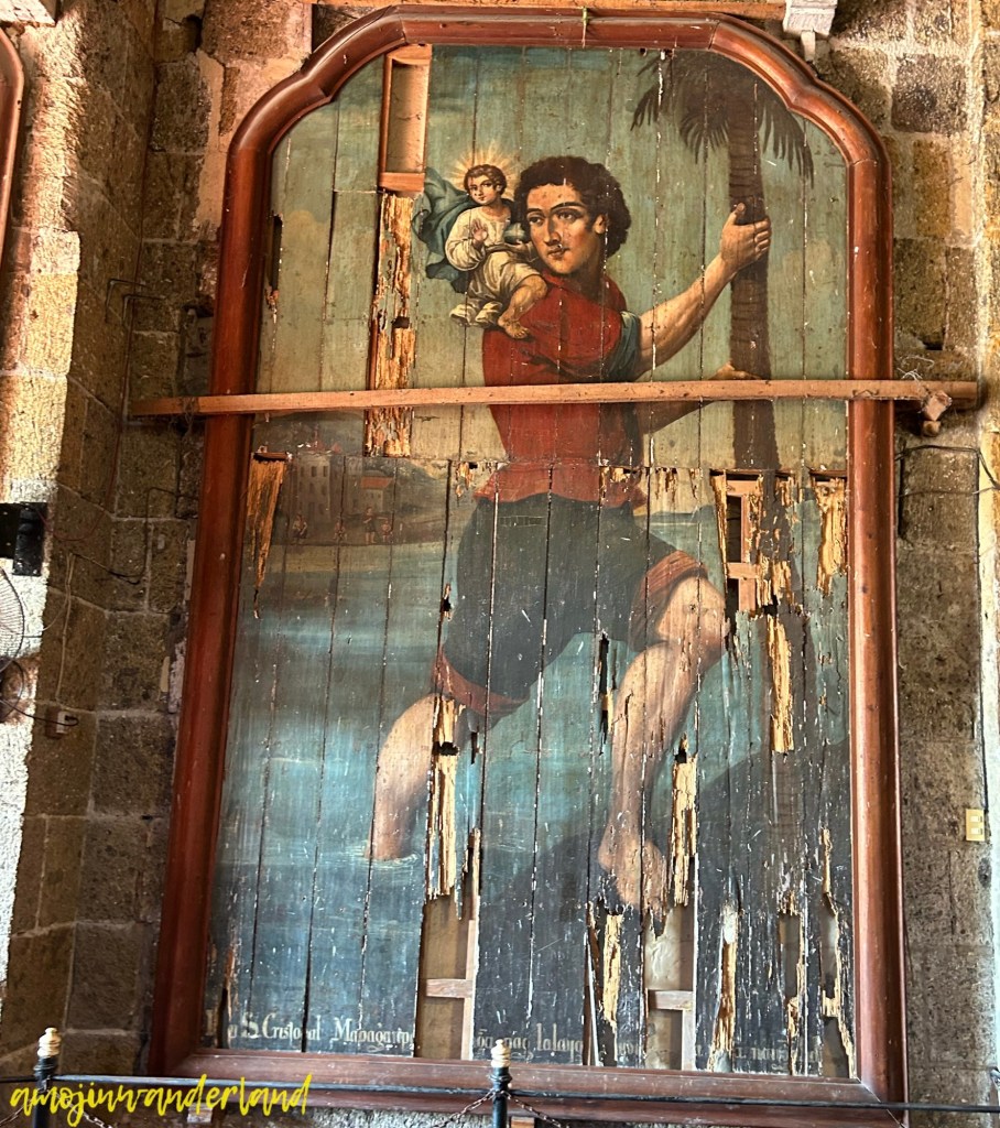 Two paintings depict San Cristobal, the patron saint of travelers. In one, he is seen carrying a child while crossing a river. Legend has it that the child, initially unknown to him, revealed himself as Christ. The other painting portrayed the saint with Oriental features. Spanish friars reportedly disapproved of these features. They replaced them with a European-featured depiction. During the restoration of the latter, the better-preserved original mural beneath it was accidentally discovered.
