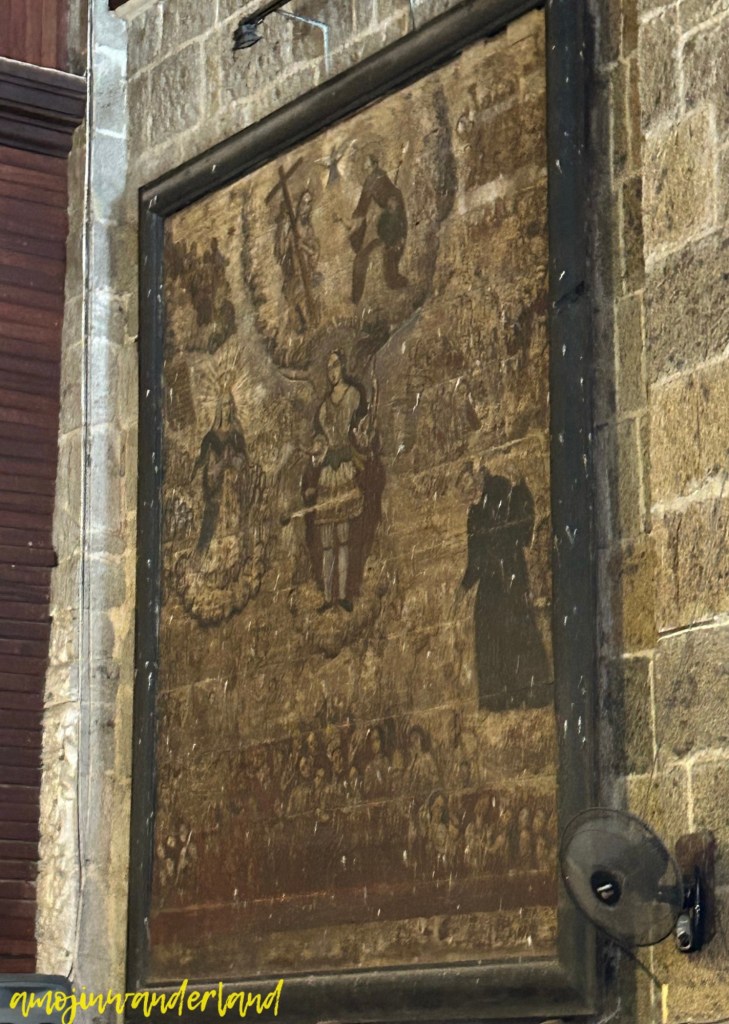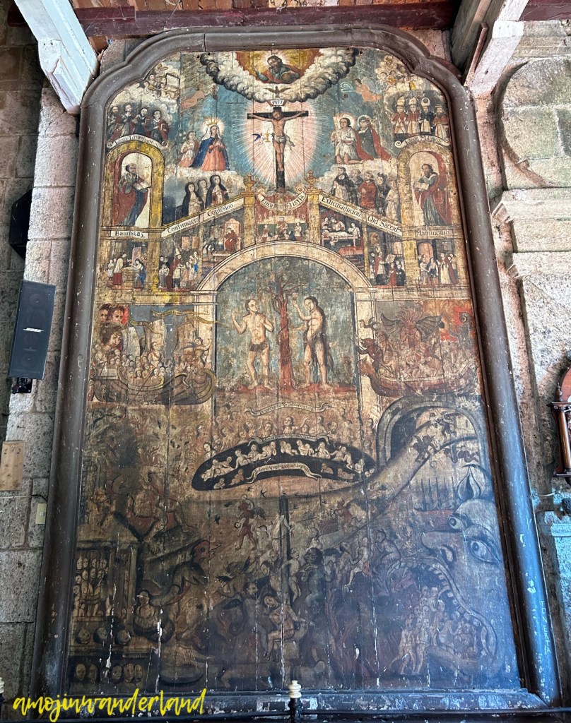 Across from the St. Christopher painting, there is another mural titled “Langit, Lupa at Impyerno” by Jose Luciano Dans. Divided into three sections, the upper part illustrates heaven with Christ’s crucifixion. The middle section emphasizes the earthly world, with Adam and Eve below the Tree of Knowledge. Below them is hell. It is marked by the anguish of depicted humans. They endure various punishments for their sins during their mortal lives.