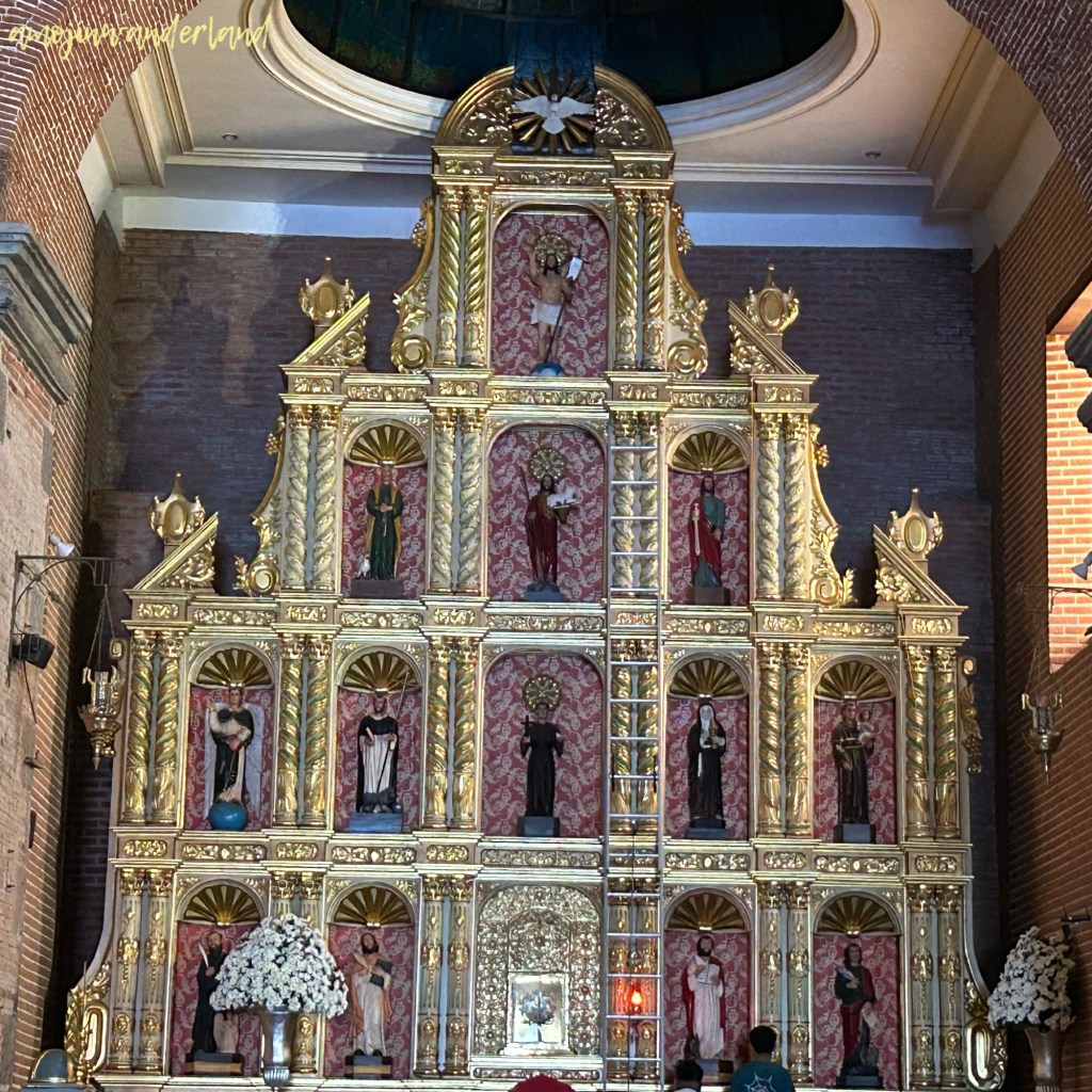 The church boasts three retablos or altars adorned in gold leaf. The central retablo, known as the retablo mayor or main altar, features thirteen niches across four levels, housing statues of saints. The tabernacle is positioned at the center of the lowest level. Flanking the main altar are two minor retablos, each with four niches for saints.