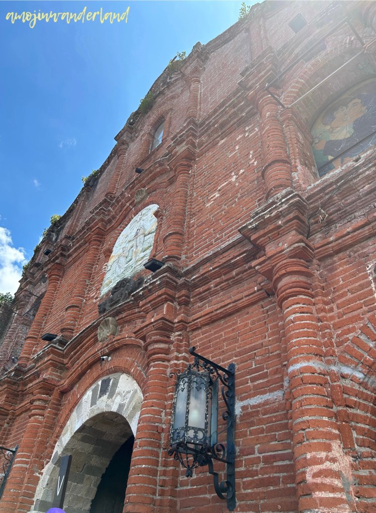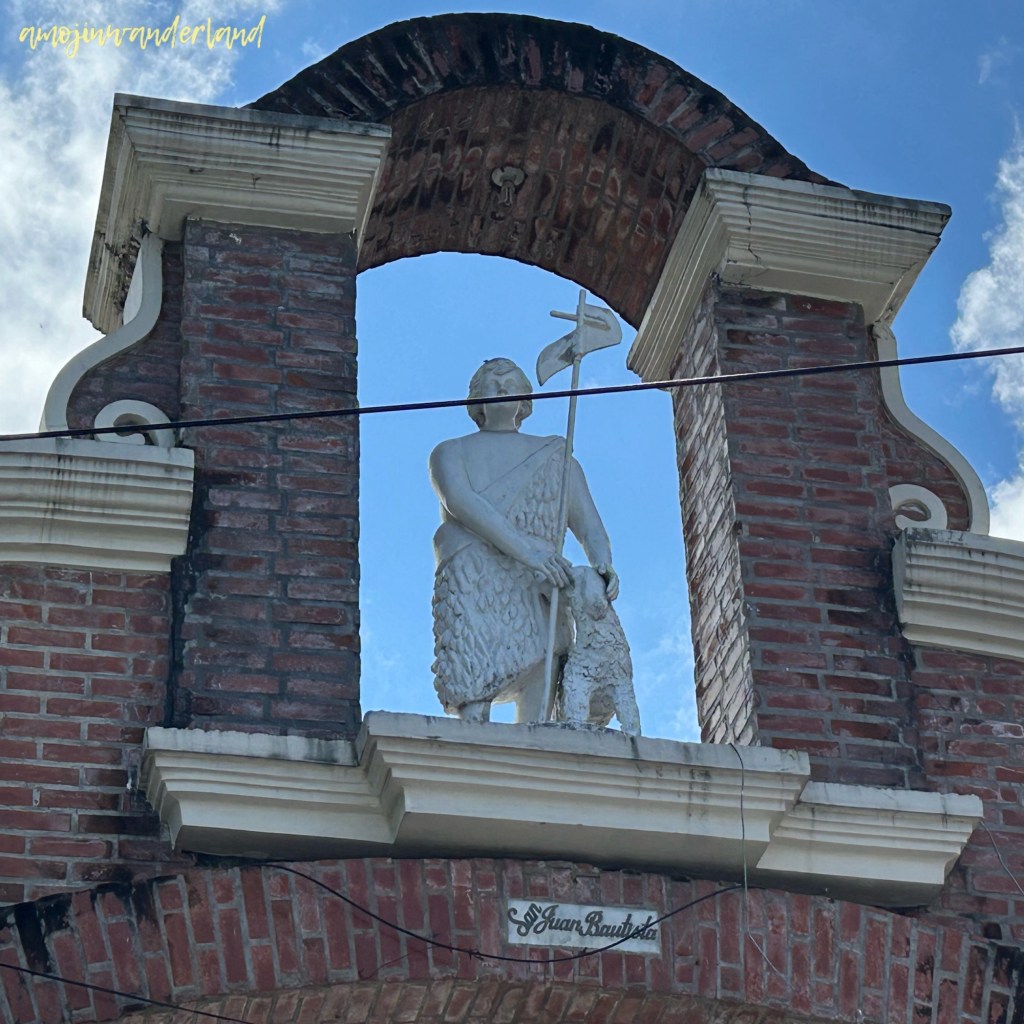 The present church, designed in the Baroque architectural style, features a blend of bright red bricks and traditional adobe in its construction. Adorning the wooden door entrance is a white sculpted depiction of the Baptism of Jesus by St. John the Baptist.