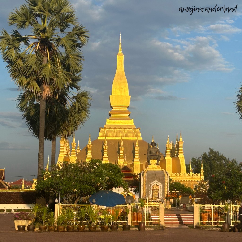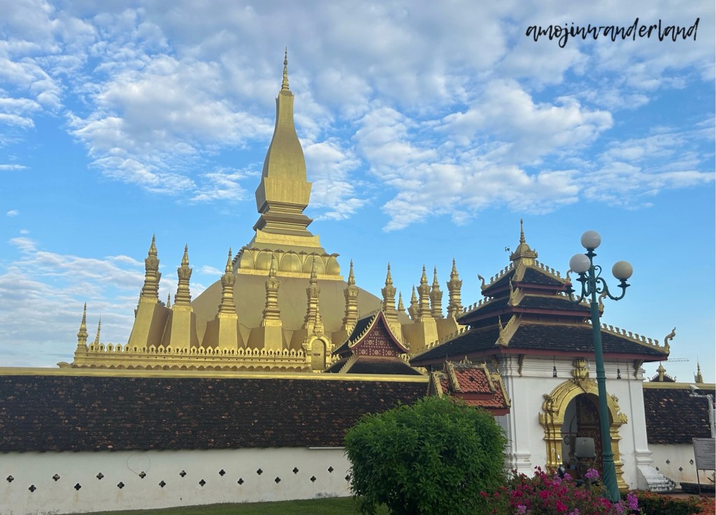 The current structure, standing 45 meters tall, features a gleaming pinnacle coated in approximately 500 kilograms of gold leaf, while the rest of the stupa is painted gold. Surrounding the stupa is a high-walled cloister, with each side measuring about 85 meters in length, enhancing its grandeur. The stupa’s present form is the result of a major restoration in the 1930s, following earlier unsuccessful attempts to revive it after the damage inflicted by the Thai invasion of 1828.