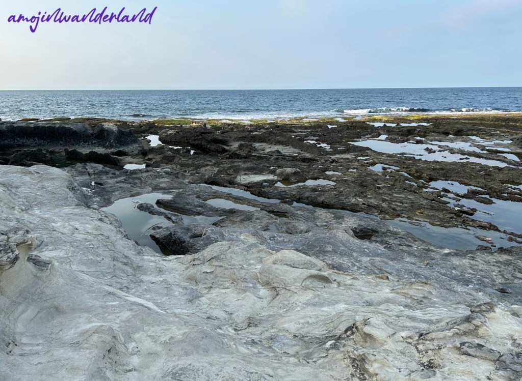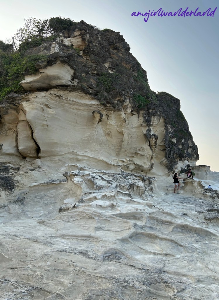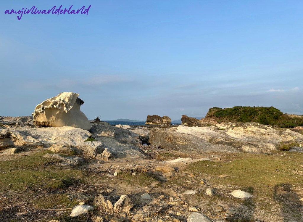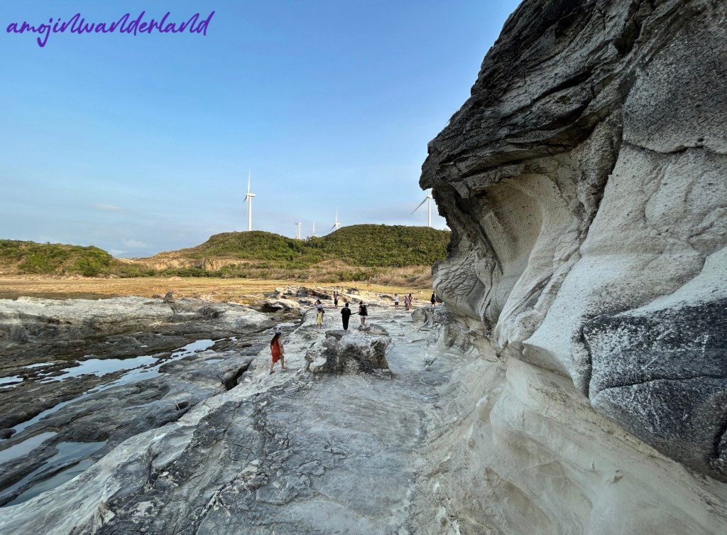 The trail was mostly dry and surrounded by grass and scattered rocks. After about 10 minutes, we finally reached the edge of the coast where the Kapurpurawan Rock Formation stood. From a distance, it looked like a large white sculpture rising from the rocky shore. The name “kapurpurawan” comes from the Ilocano word “puraw”, meaning white. It’s easy to see why. The rocks are a bright, almost chalky white, especially under the afternoon sun.