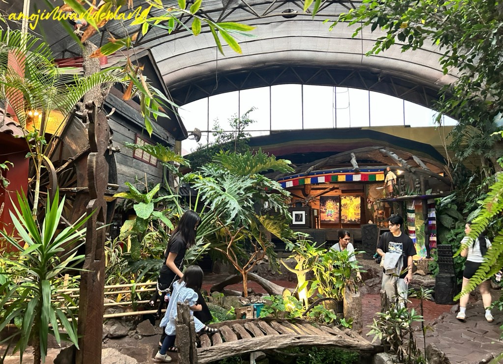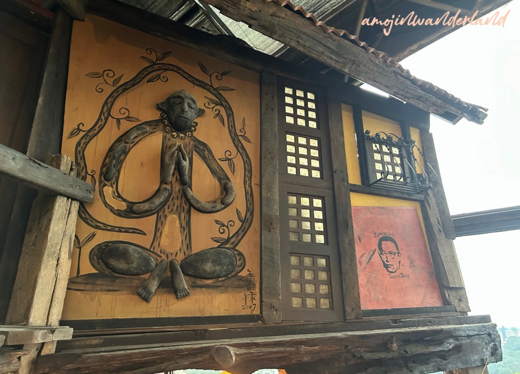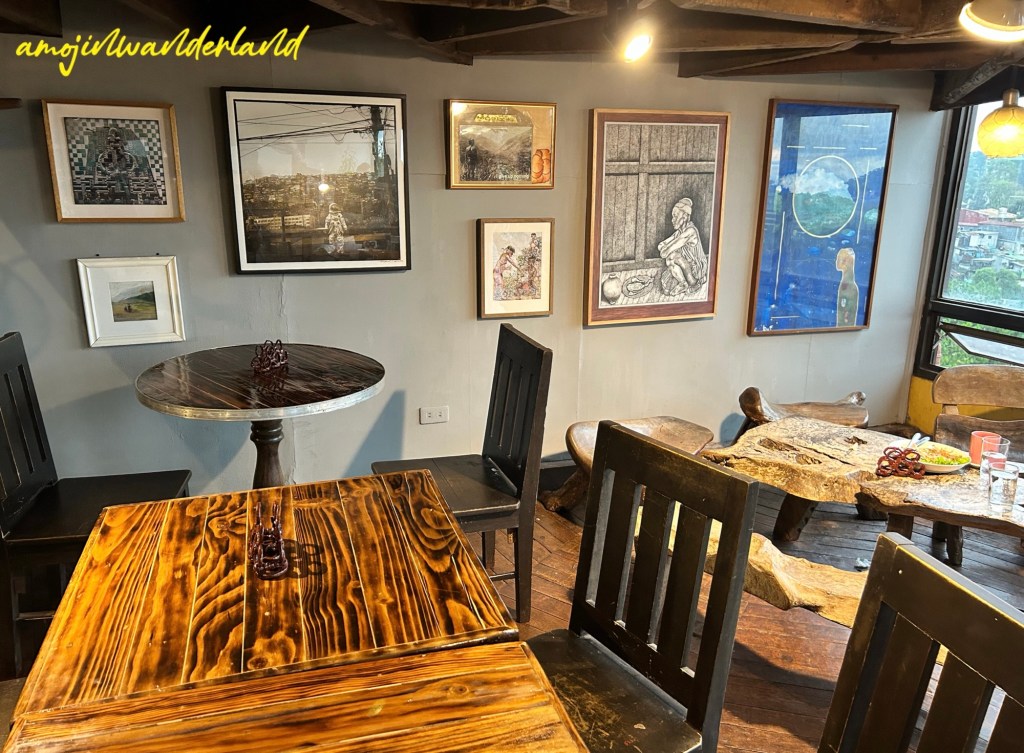 Once inside, you’re surrounded by greenery, murals, driftwood sculptures, and indigenous artworks. A koi pond with a wooden bridge spans the center, and long-lost artifacts hang on rustic walls. The space is divided into unique zones—seating near the art gallery, a mock ship centerpiece, mezzanine dining, and even treehouse-inspired tables by the windows overlooking downtown Baguio.