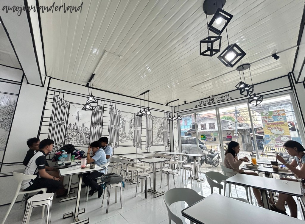 I stumbled upon Miss Bibimbap almost by chance, just across from where I was staying at Hotel Alejandro in Tacloban. Its exterior didn’t scream for attention, yet there was something about the clean, modern façade that piqued my curiosity. The moment I stepped inside, I was instantly transported into another world, a black-and-white universe that looked straight out of a comic book.