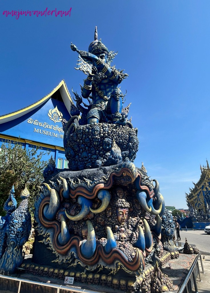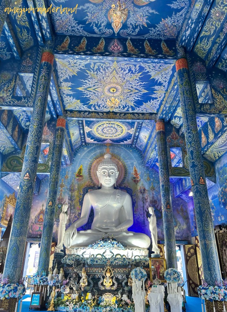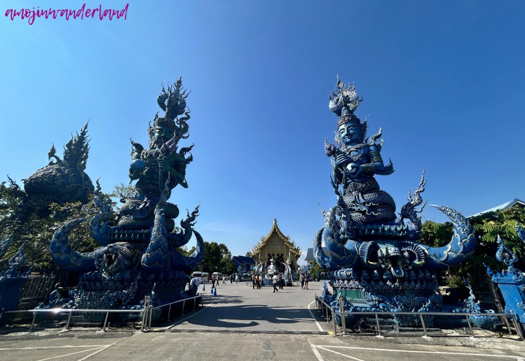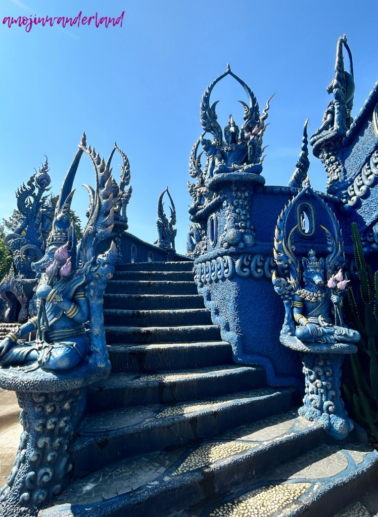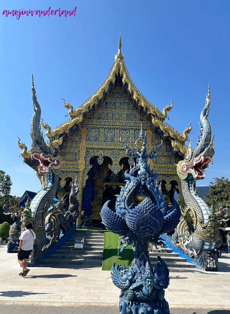 If Wat Rong Khun is known for its bright white surfaces and mirrored details, Wat Tong Suea Ten, better known as the Blue Temple, offers a contrasting experience through deep blue tones and gold accents. Both temples represent contemporary interpretations of Buddhist art in Chiang Rai, but while the White Temple emphasizes light and reflection, the Blue Temple creates a calmer, more enclosed visual atmosphere.