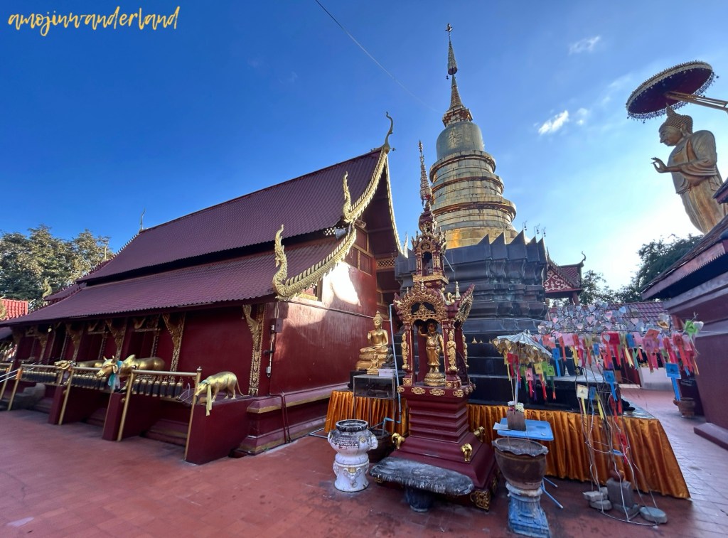 Wat Doi Ti reflects a blend of traditional Lanna architecture and more recent developments. Located behind the large statue of Kruba Srivichai are the temple’s viharn (main hall) and a golden chedi, which form the architectural core of the complex. Inside the viharn are notable Buddha images, including a standing Buddha and another depicted in the Paleilaï posture, a representation that is relatively uncommon in northern Thai temples. The approach to the buildings is marked by naga-lined stairways, layered gabled roofs, and carved wooden doors, elements that clearly reflect the craftsmanship and stylistic features typical of Lanna religious structures.