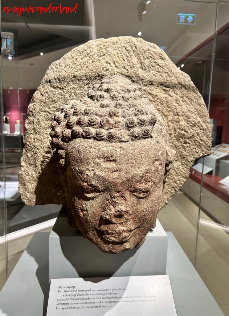 From these earliest foundations, the exhibition moves seamlessly into the Dvaravati–Hariphunchai period, when Lamphun emerged as a significant political and religious center. Tradition attributes the introduction of Dvaravati civilization to Queen Camadevi, who ruled Hariphunchai after arriving from Lavo. Stone sculptures, stucco reliefs, terracotta objects, and bronze works from this era reflect both artistic refinement and spiritual authority. The Buddha images are particularly striking, characterized by square faces, eyebrows joined in a single line, bulging downward-cast eyes, and tense, grimacing mouths. Often featuring whisker-like details and known as “Beard Buddha” images, these figures project power and intensity, expressing Mahayana Buddhist ideals rather than gentle serenity.
