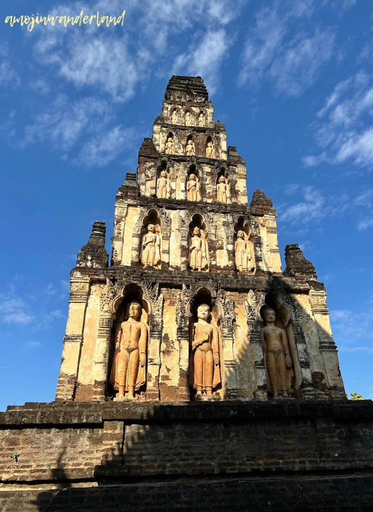 Rising to a height of about 21 meters, the brick chedi is coated in stucco and set on a square base. Above it rise five square tiers of gradually diminishing size. Each side of every tier contains three niches, enshrining standing Buddha images that become smaller toward the summit. These images, cast in molds during the 1218 reconstruction, are shown in the Abhaya mudra, with the right hand raised to dispel fear. Framing the niches are delicately executed stucco decorations, adding refinement to the otherwise austere geometry of the structure.