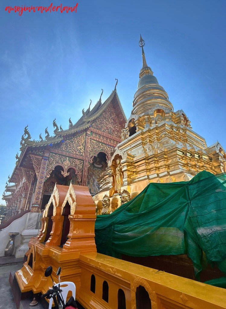 Most of the existing structures in the compound date to the 1940s rather than the early Haripunchai period. Despite this, the temple retains architectural interest, especially the hor trai, or scripture library. This wooden building is marked by steep gables and traditional Thai roof ornaments known as chofah. In front of it stands a tall, narrow bell tower of similar age, along with a small wooden shrine and a drum tower, all reflecting the design sensibilities of the mid-20th century.