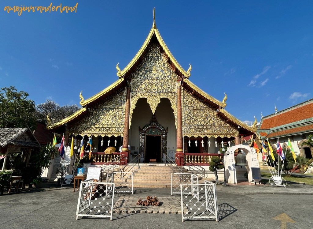 Wat Chiang Man has two main wihans. The larger Main Wihan was renovated in the 1920s by the revered monk Khru Ba Srivichai. Inside is a large mondop-style altar surrounded by Buddha images. Among them is a standing Buddha with the year 1465 engraved on its base, often identified as the oldest known statue from the Lanna Kingdom and the earliest Thai Buddha image depicted holding an alms bowl. The façade of the wihan is decorated with gilded carvings of Kirtimukha set among floral and plant motifs.
