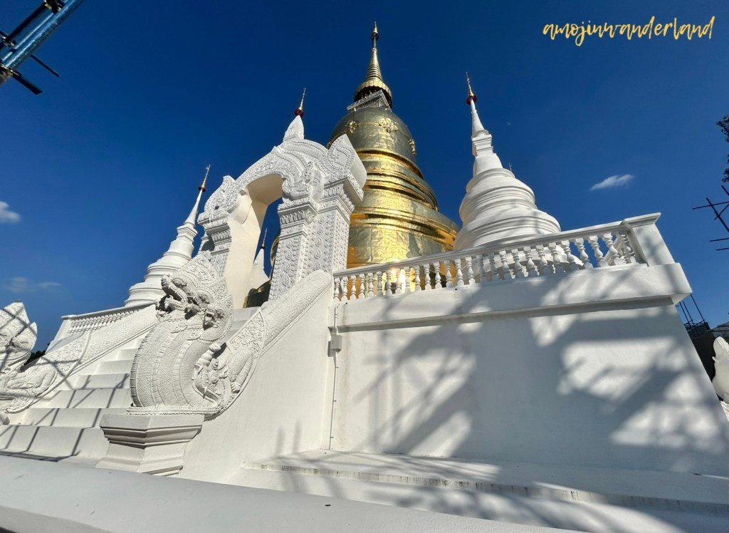 The most prominent structure within Wat Suan Dok is its large bell-shaped chedi, standing approximately 48 metres high and visible from a distance. Built in a Sri Lankan style, the chedi is believed to contain a relic of the Buddha. Ramps now lead to the upper terrace on all four sides, replacing the original stairways. The balustrades are decorated with seven-headed nāgas emerging from makaras, a motif characteristic of classic Lanna design.