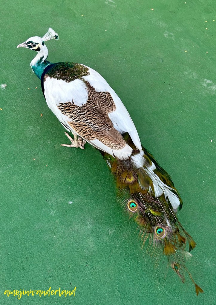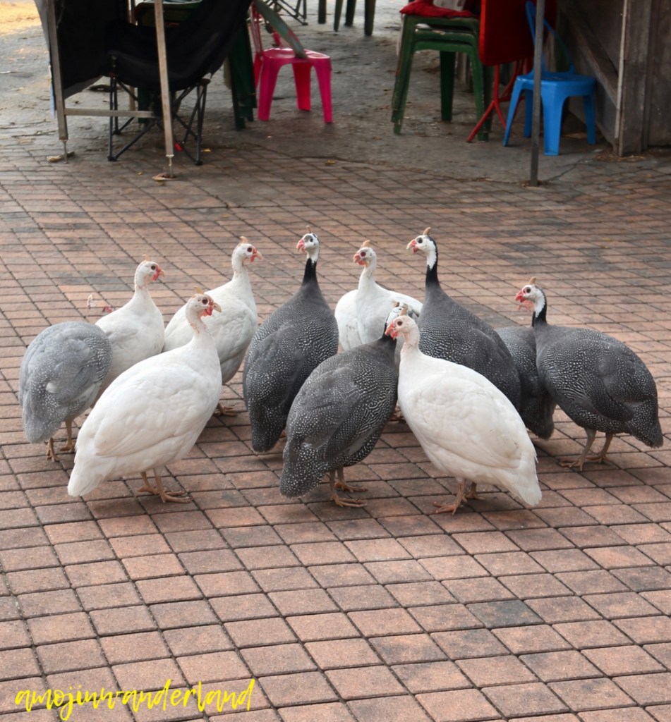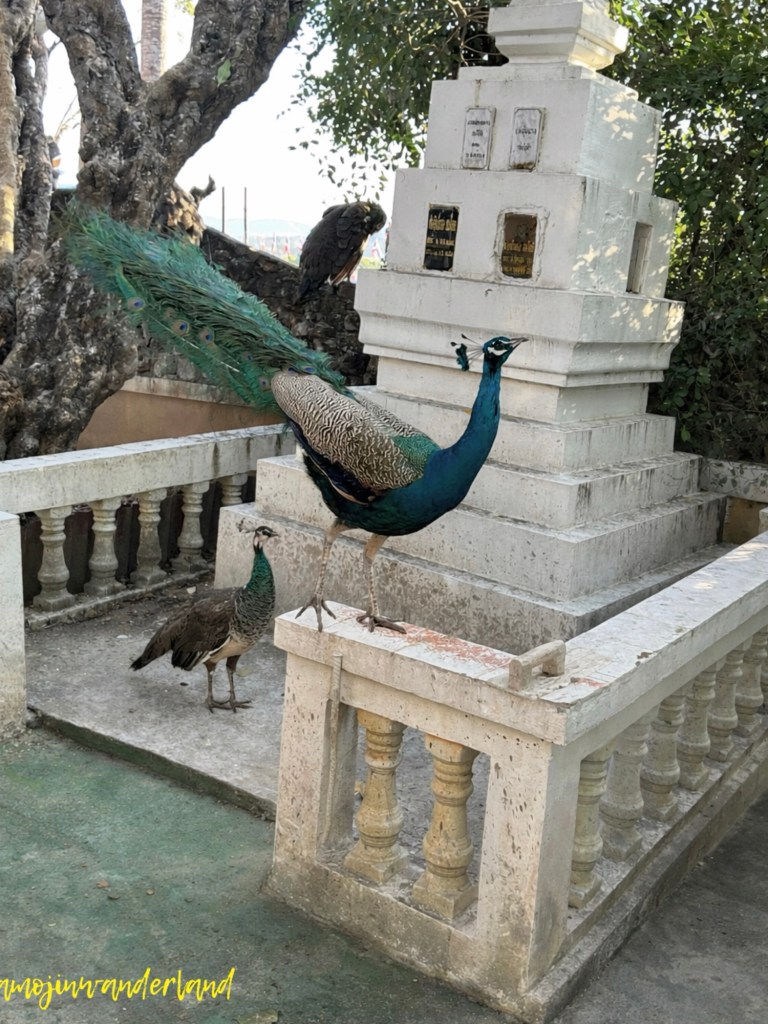 The peacocks and Guinea fowls we saw at Wat Doi Ti were one of those unexpected sights that instantly made the visit more memorable. I honestly had no idea why they were there, but they were undeniably beautiful. The birds we casually call “peacocks” are actually Indian peafowl (Pavo cristatus), and seeing them up close made it easy to understand why they are so admired. Their feathers shimmered with deep greens and blues, catching the light in a way that almost looked unreal. Even when they weren’t displaying their full tail, they carried themselves with a calm elegance, moving slowly and confidently as if they knew they were meant to be noticed.