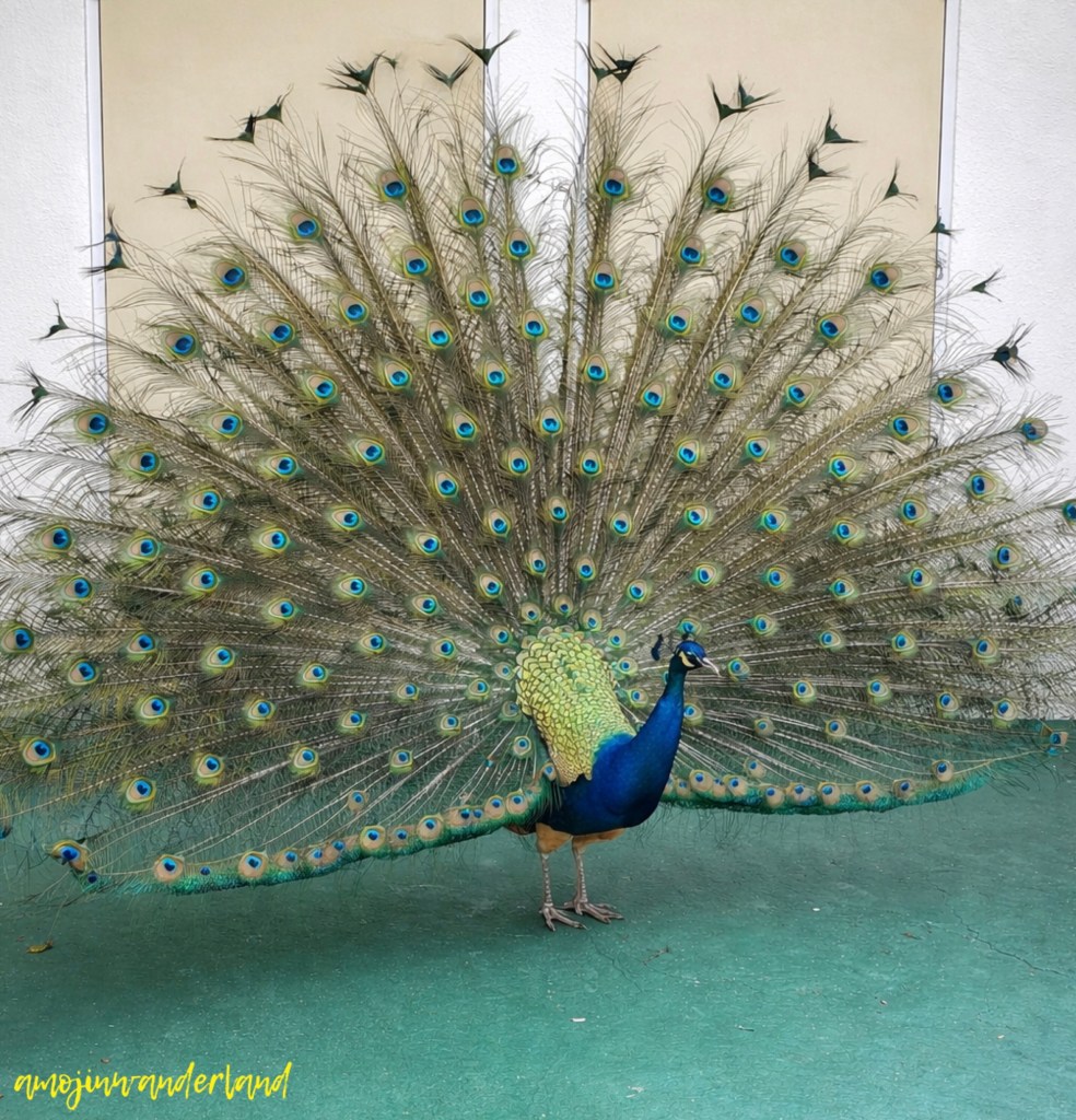The other birds roaming around were not turkeys after all, but Domestic Guinea Fowl (Numida meleagris). They had a completely different kind of charm, smaller, speckled, and full of personality. Their dotted feathers and quick, busy movements made them stand out in their own way, adding a lively contrast to the graceful presence of the Indian peafowl. They seemed perfectly at ease, walking about as though they were part of the temple grounds’ everyday rhythm.
